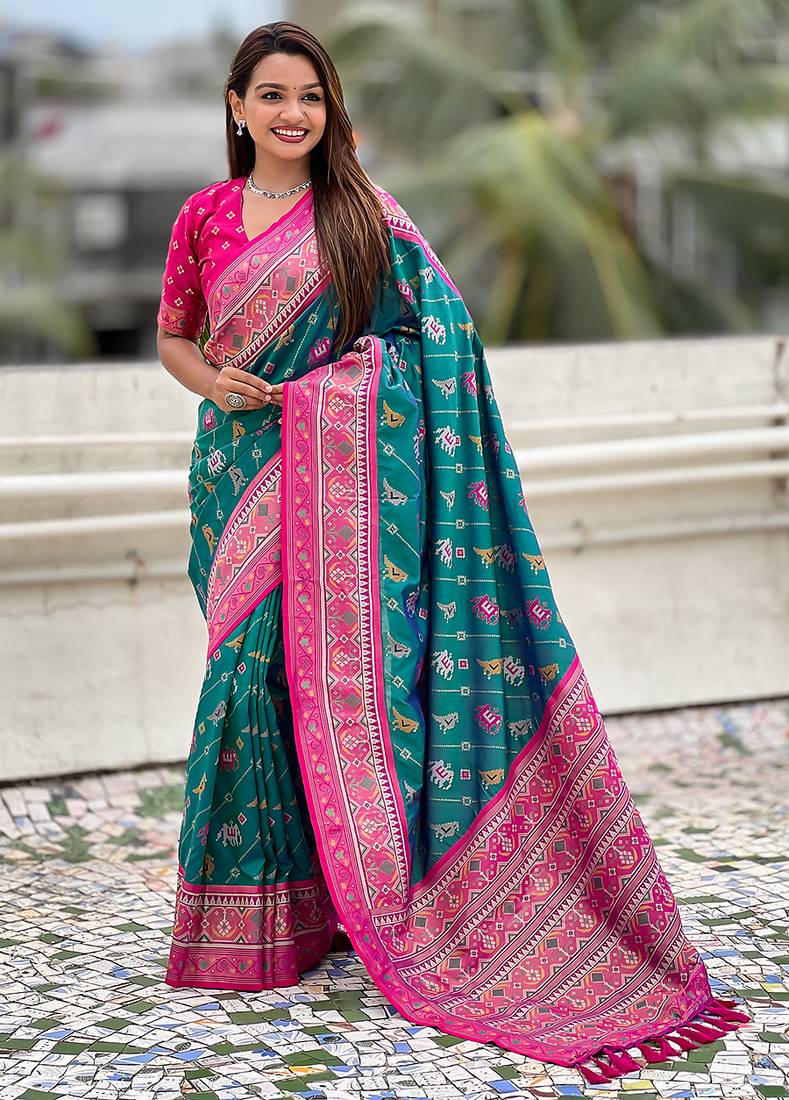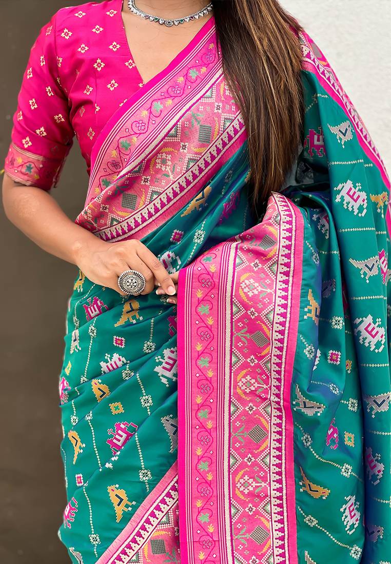 Teal green woven self design silk blend patola saree with blouse