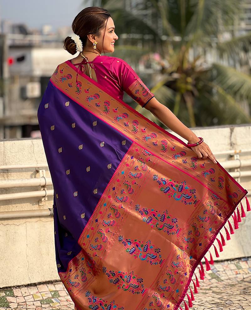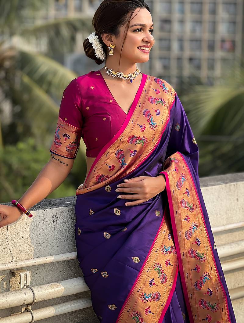 Violet woven self design pure silk paithani saree with blouse
