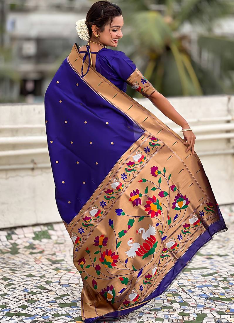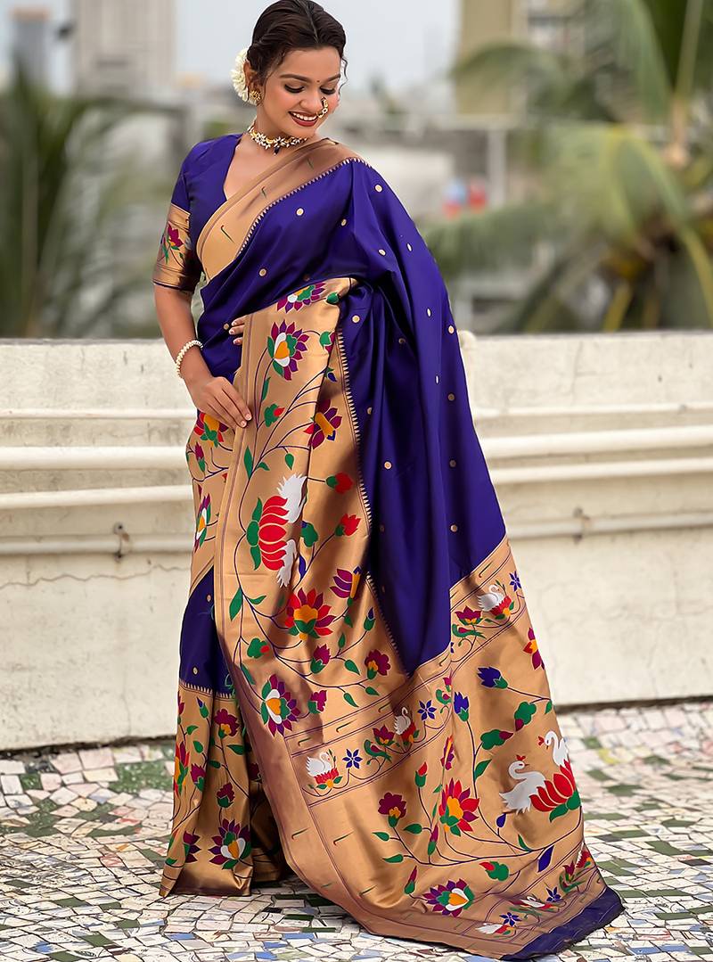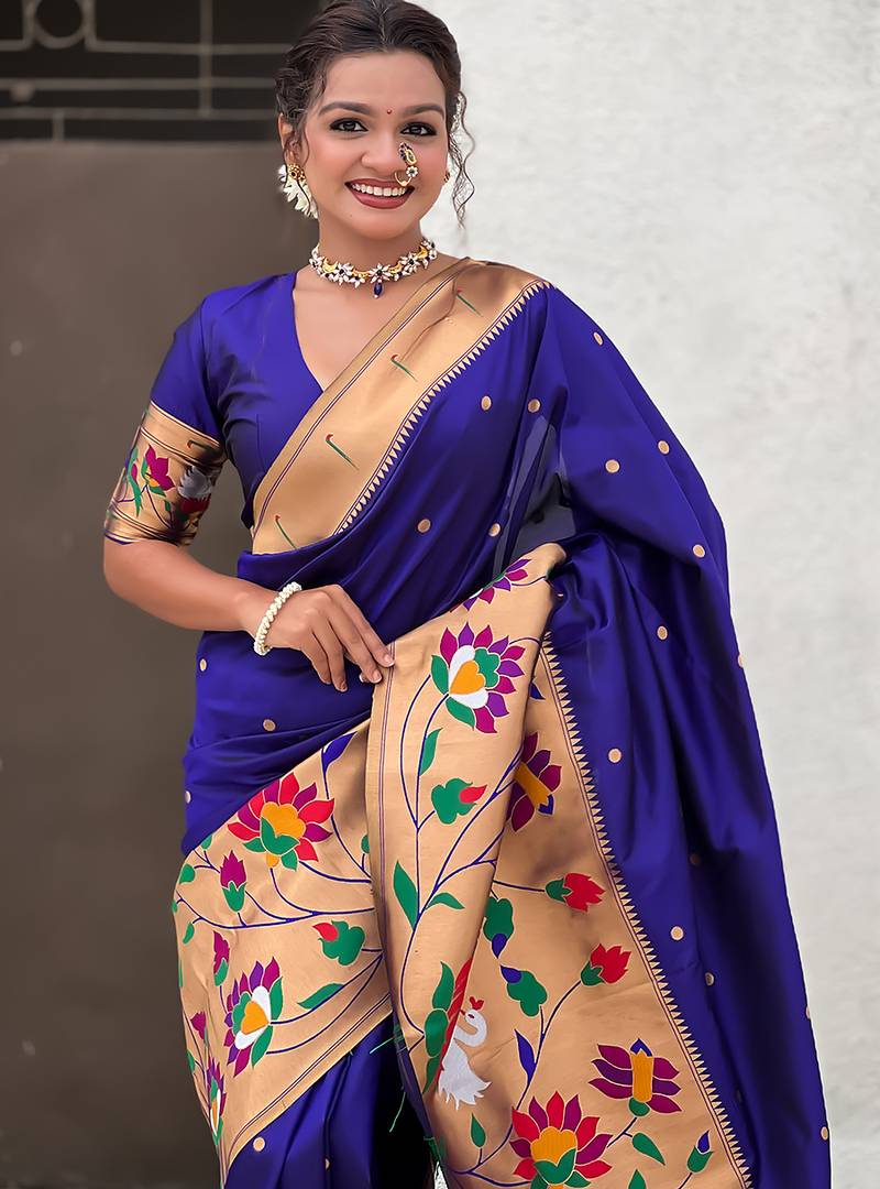 | Product Description | Paithani Silk Saree With Gold Zari Polka Motifs All Over The Body Having Rich Woven Meenakari Paithani Meenakari Designer Pallu, Half Half Paithani Unique Border And Paired With Running Blouse Same As Shown. |