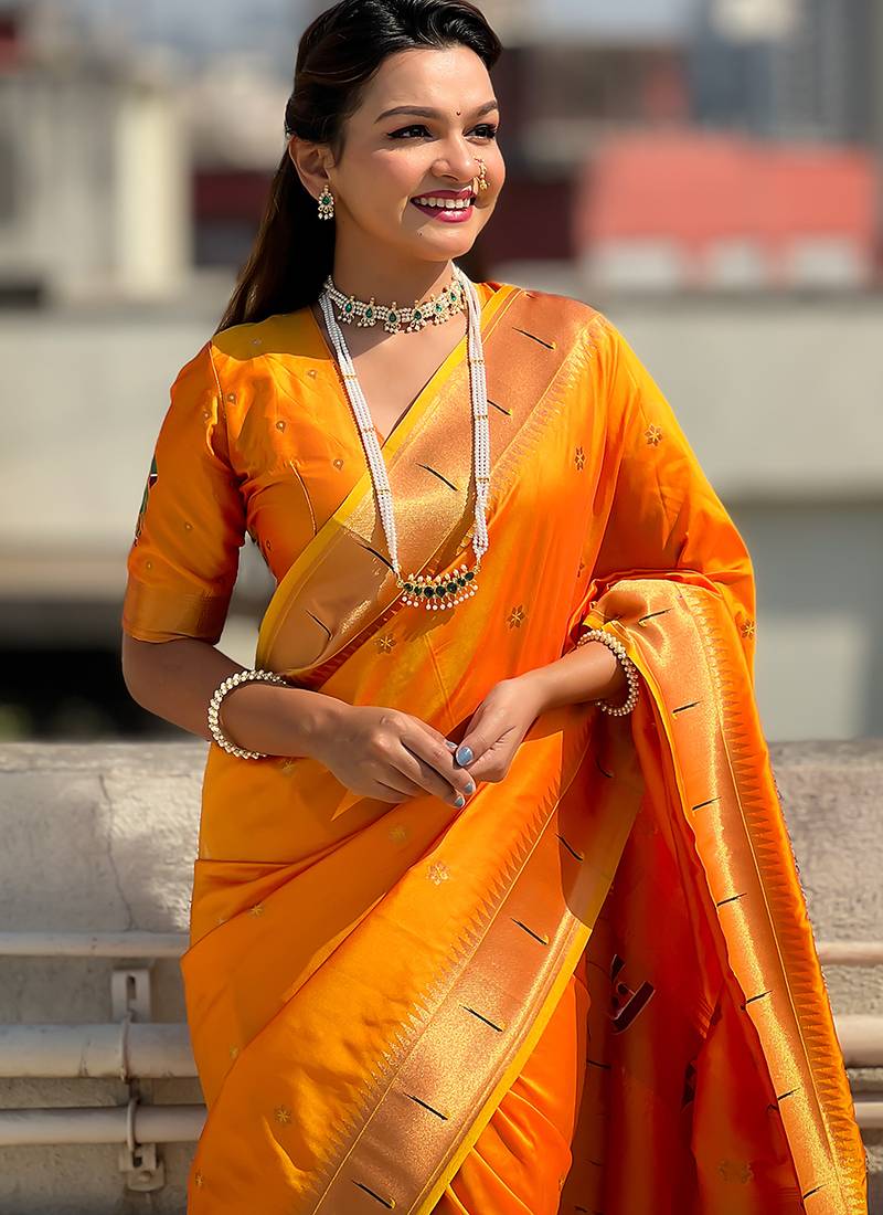 | Product Description | Soft Silk Sarees With Floral Motifs Weaves All Over The Body Having Rich Woven Paithani Vitthala Pallu And Muniya Paithani Border Paired With Silk Blouse Same As Shown |