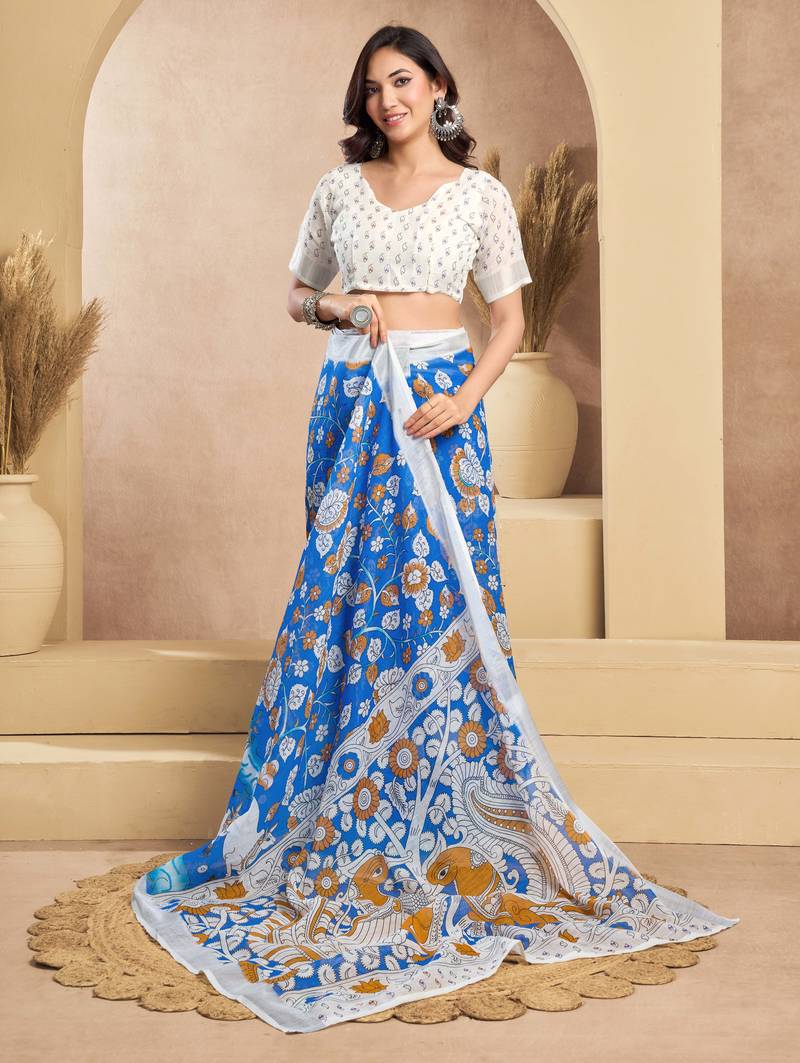 | Product Name | Blue Linen Blend Printed Kalamkari Ready To Wear Saree With Unstitched Blouse | |