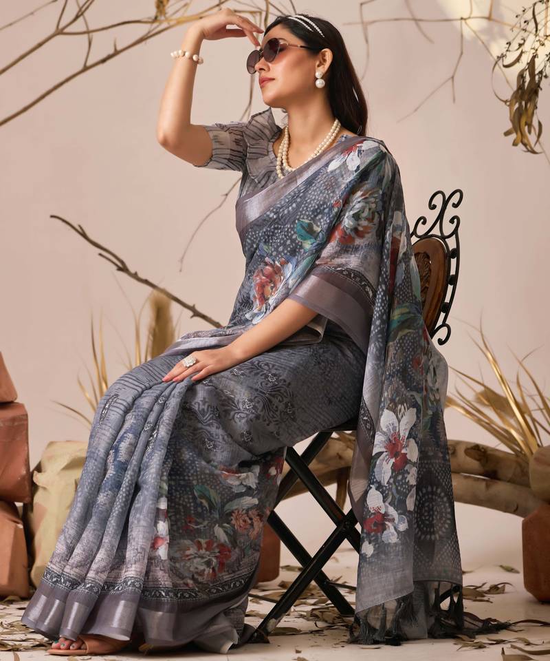 | Product Name | Grey Linen Cotton Digital Floral Printed Saree With Patola Border | Contemporary Printed Linen Saree With Blouse | |