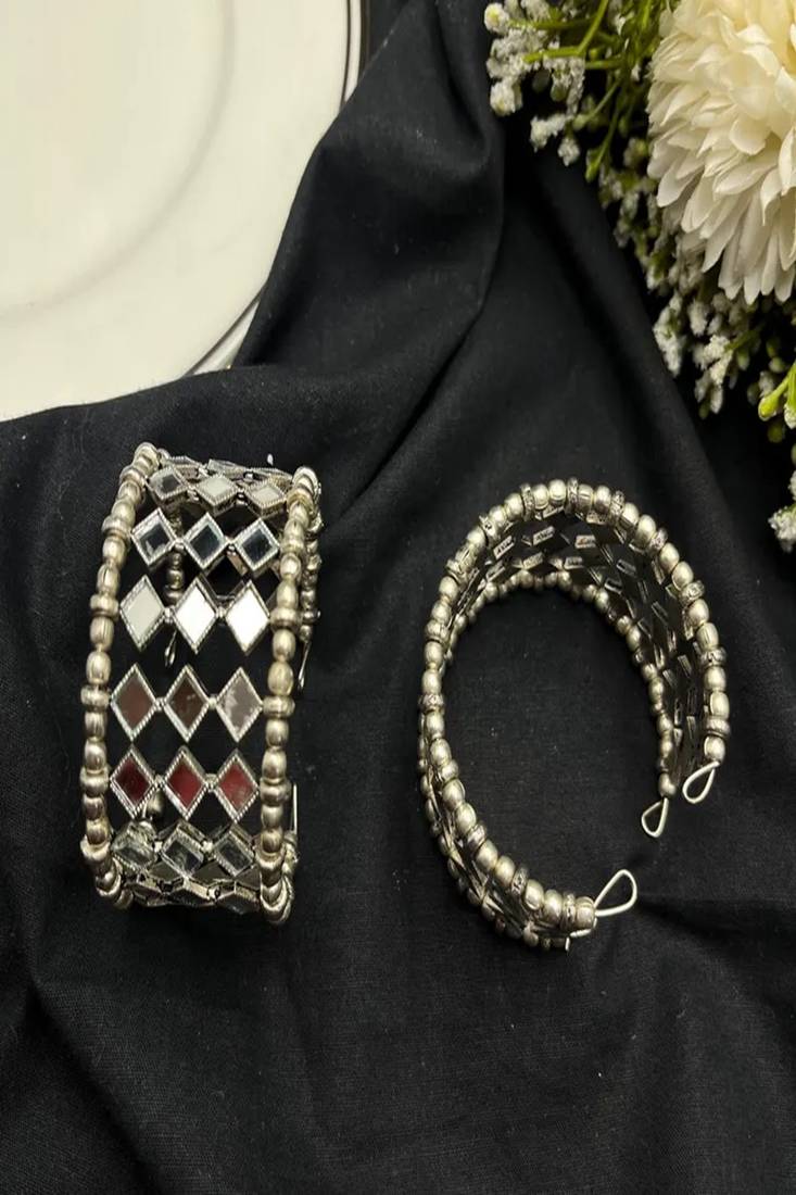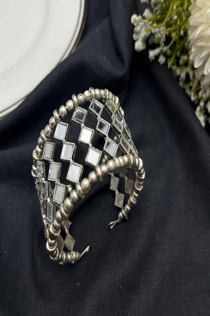 | Product Description | Make A Bold Statement With This Stunning Silver Mirror Kada Bangle Set, Designed For Women Who Love Traditional Elegance With A Modern Boho Twist. Featuring Intricate Square Mirror Detailing Arranged In A Lattice Pattern And Finished With Classic Silver Bead Edges, This Bracelet Stack Adds Instant Glam To Any Outfit.