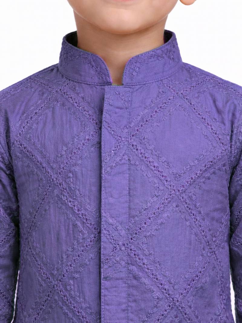 Boys purple hakoba cotton kurta pyjama set with geometric thread embroidery