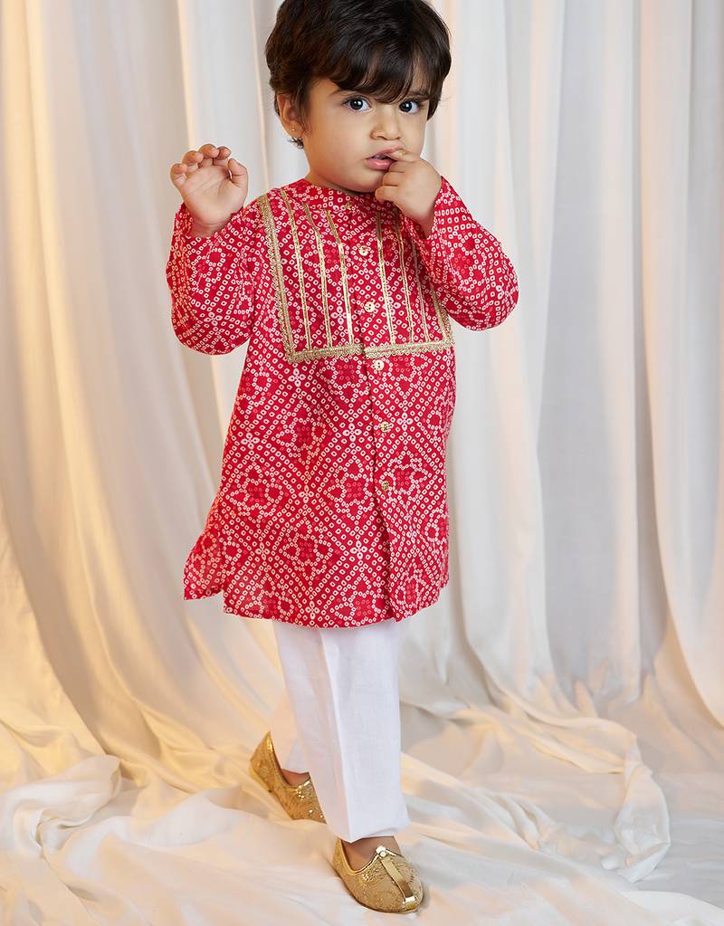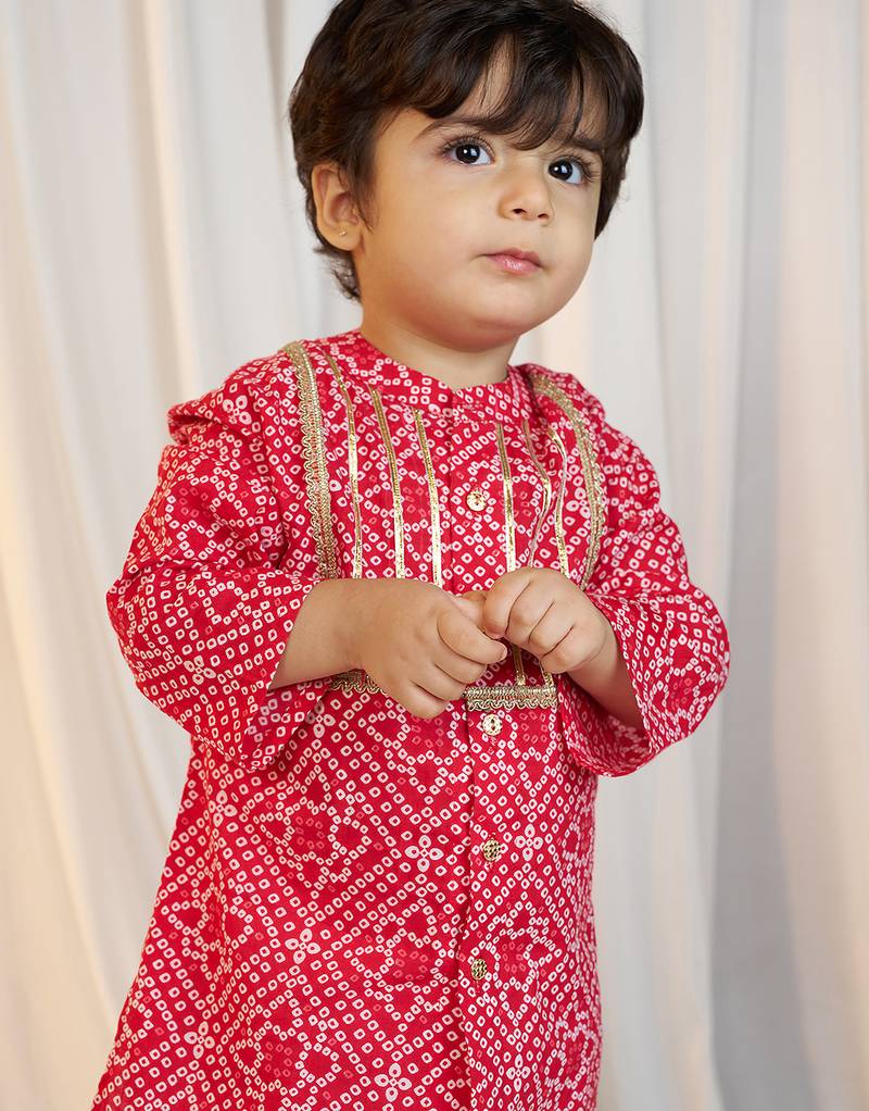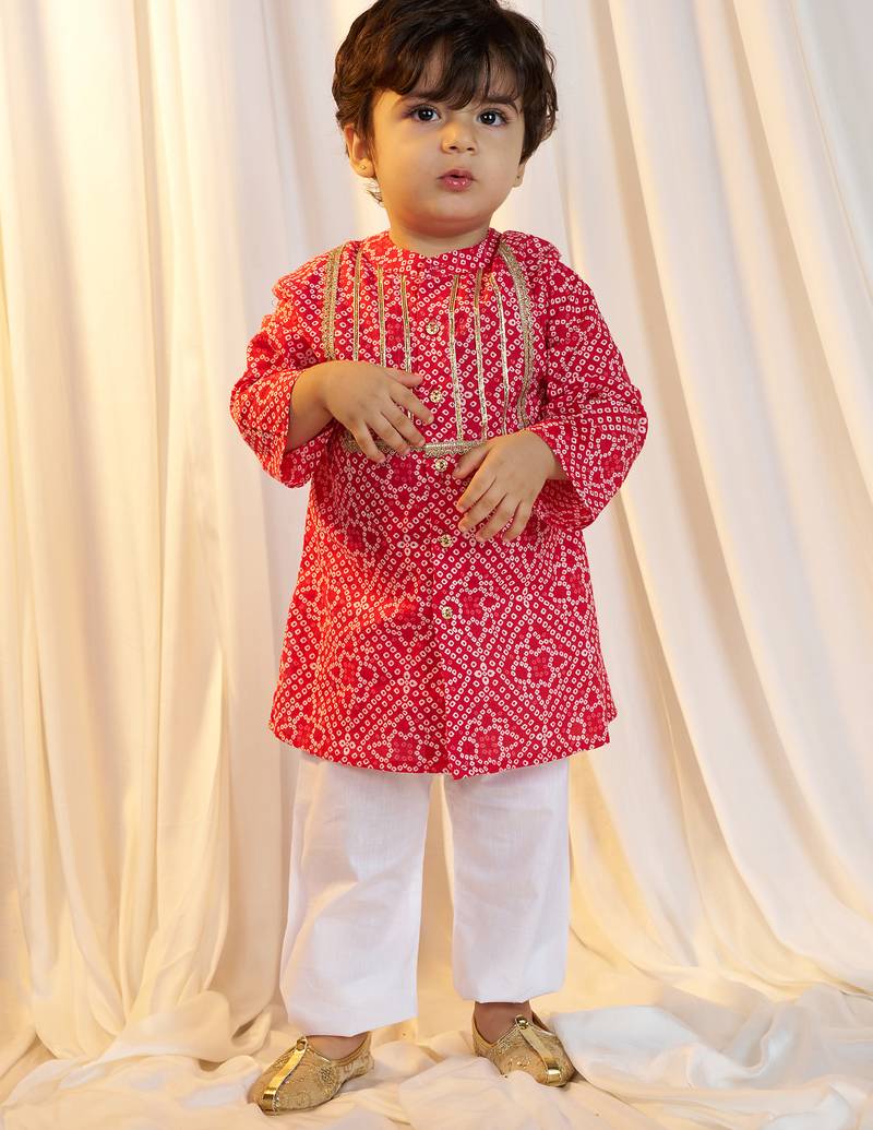 | Product Description | Premium Boys Ethnic Wear Kurta Set Featuring Beautiful Red Cotton Fabric With Bandhani Digital Print. Perfect For Festivals Like Janmashtami, Durga Puja, Navratri And Diwali. Complete Set Includes Kurta And White Pyjama With Lace Detailing. |