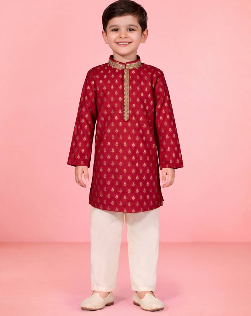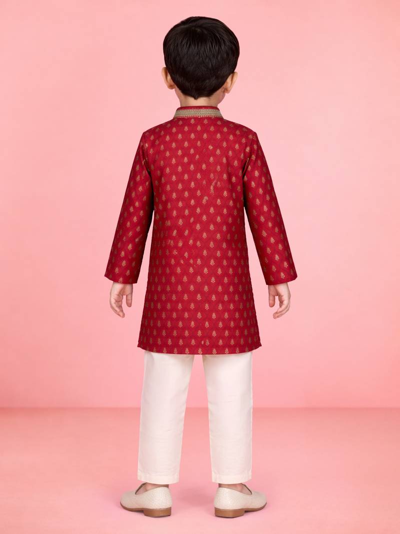 | Product Name | Boys Red Jacquard Silk Blend Kurta With Cream Pyjama Wedding & Festive Wear | |