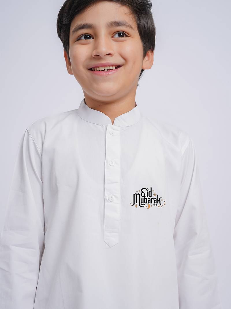 Boys white pure cotton kurta pyjama set with eid mubarak print