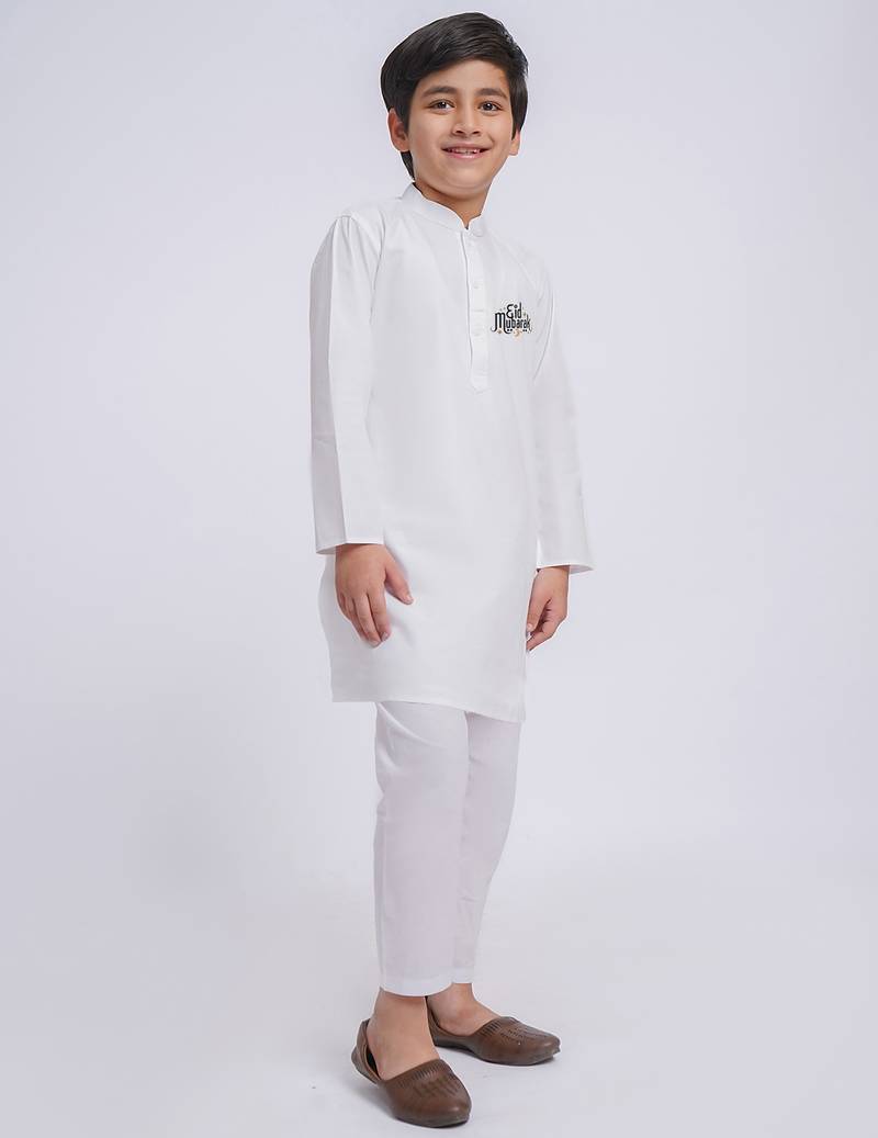 | Product Name | Boys White Pure Cotton Kurta Pyjama Set With Eid Mubarak Print | |