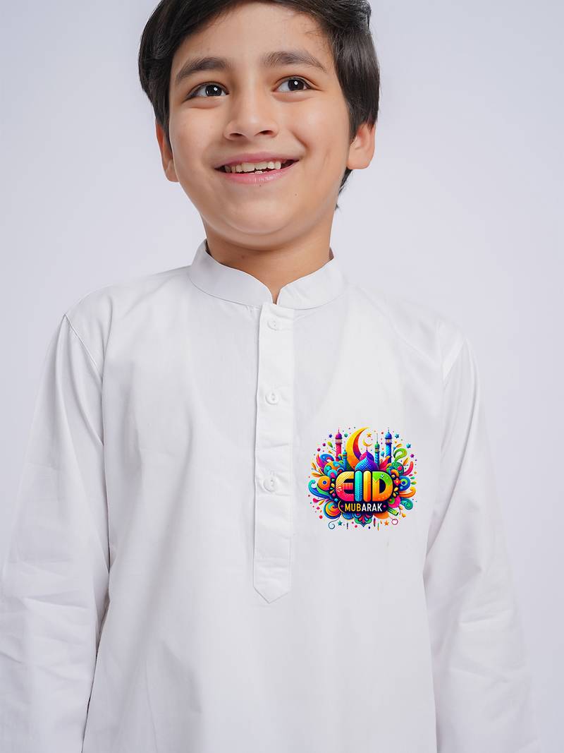 | Product Name | Boys White Pure Cotton Kurta Pyjama Set With Eid Mubarak Print | |