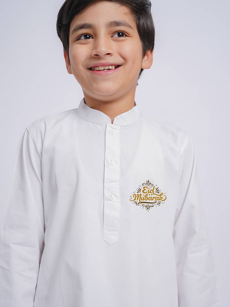 Boys white pure cotton kurta pyjama set with eid mubarak print