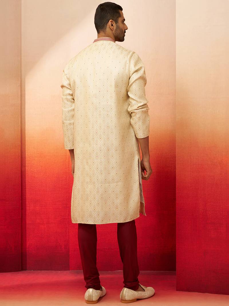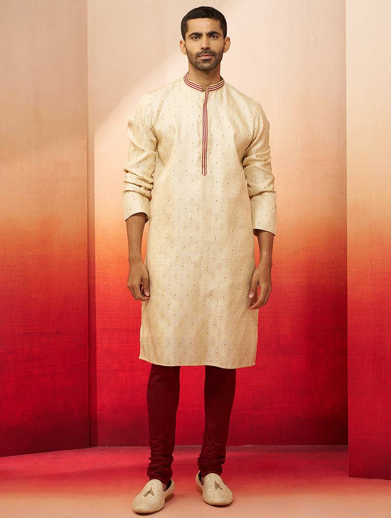 | Product Description | Experience Luxury With This Cream Kurta Featuring Maroon Motifs And Exquisite Thread Zari Embroidery. Premium Silk Blend Fabric With Maroon Churidar For Weddings, Diwali, And Special Celebrations. | |
