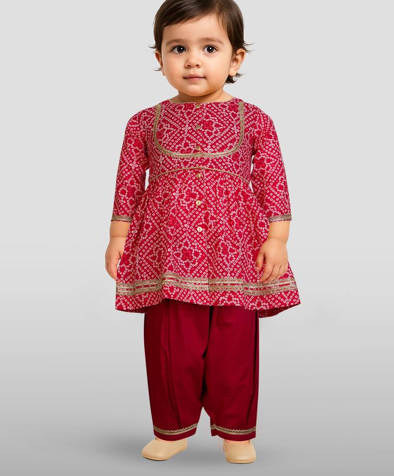| Product Description | Premium Girls Ethnic Wear Kurta Set Featuring Beautiful Red Cotton Fabric With Bandhani Digital Print. Perfect For Festivals Like Janmashtami, Durga Puja, Navratri And Diwali. Complete Set Includes Kurta And Patiala With Lace Detailing. |