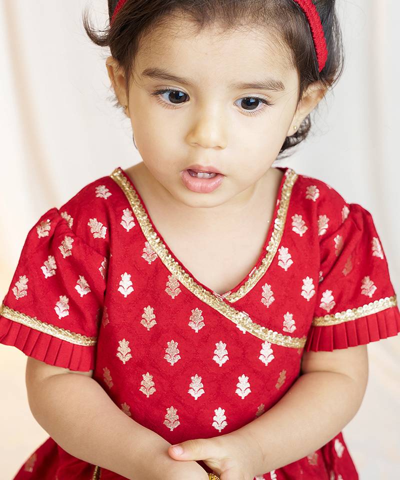 Girls wear red jacquard ethnic set with floral print