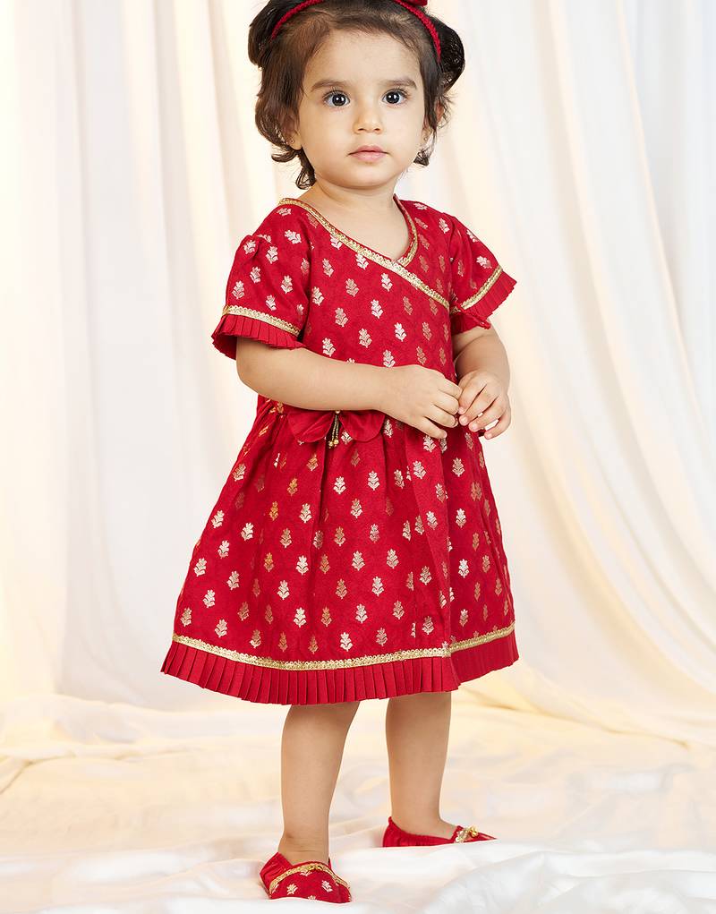 | Product Description | This Girls Wear Ethnic Set Includes A Red Viscose Frock With Elbow Sleeves, Paired With Matching Pants, Hairband, Shoes, And A Swaddle. The Frock Features Intricate Jacquard Floral Patterns For Detailed Traditional Styling. The Pants Are Designed With An Elasticated Waistband For Ease Of Movement. Crafted From Soft Viscose Fabric, The Outfit Ensures Breathability And Lightweight Comfort. The Hairband, Shoes, And Swaddle Complete The Coordinated Ensemble. This Stitched Set Is Suitable For Festivals Such As Janmashtami, Durga Puja, Navratri, And Diwali. The Combination Of Jacquard Floral Detailing And Structured Construction Creates A Balanced Ethnic Outfit Appropriate For Girls During Cultural Occasions. |