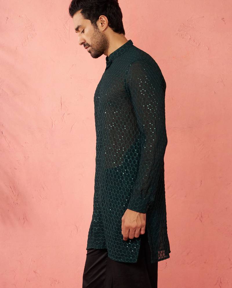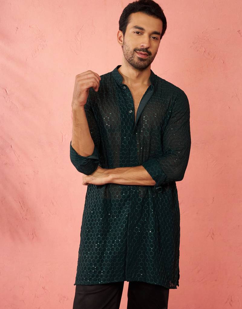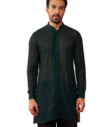Men bottle green georgette mid kurta - premium honey comb embroidery party wear
