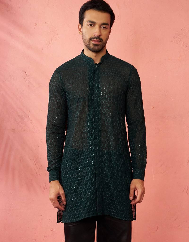 Product Name | Men Bottle Green Georgette Mid Kurta Premium Honey Comb Embroidery Party Wear | |