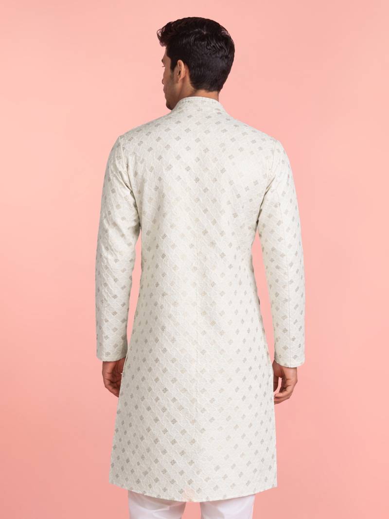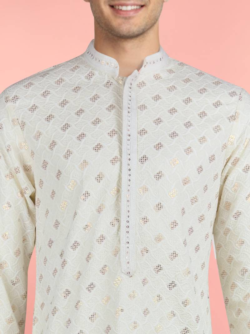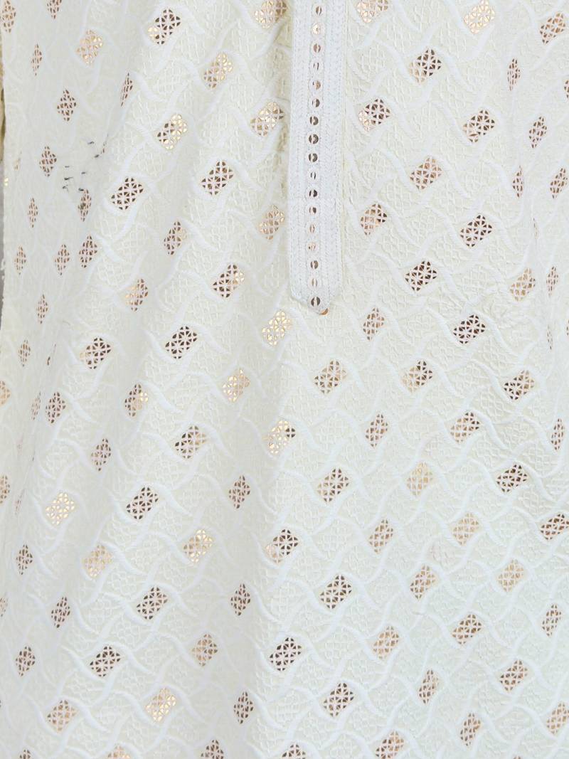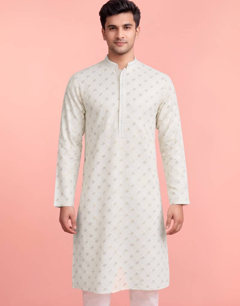 This Cream Rayon Kurta For Men Is Designed With All Over Sequin Embroidery In Geometric Motifs, Offering A Refined And Festive Appearance. The Straight Cut, Knee Length Silhouette Includes A Mandarin Collar, Full Sleeves, And Side Slits For Comfortable Movement. Made From Premium Rayon, The Kurta Ensures A Smooth Texture And Breathable Wear During Weddings And Festive Events. Functional Inseam Pockets Provide Practical Use. The Cream Base Fabric Highlights The Sequin Detailing While Maintaining A Traditional Ethnic Style. Pairing With Matching Or Gold Churidar Completes A Polished Look. The Kurta Balances Subtle Shine, Structured Tailoring, And Modern Design For Special Celebrations.