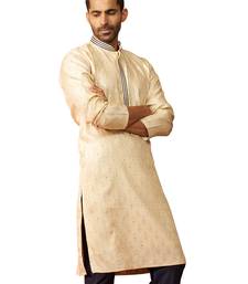 Product Description | Experience Royal Elegance With Vastramay's Cream Silk Blend Kurta Featuring Royal Blue Motif With Jacquard Ethnic Design And Thread With Zari Embroidery On Collar And Placket. Concealed Placket With Mandarin Collar, Premium Crepe Lining, Knee Length With Side Slits And Functional Inseam Pockets. Perfect For Festive Occasions, Weddings, Diwali, And Navratri Celebrations. |