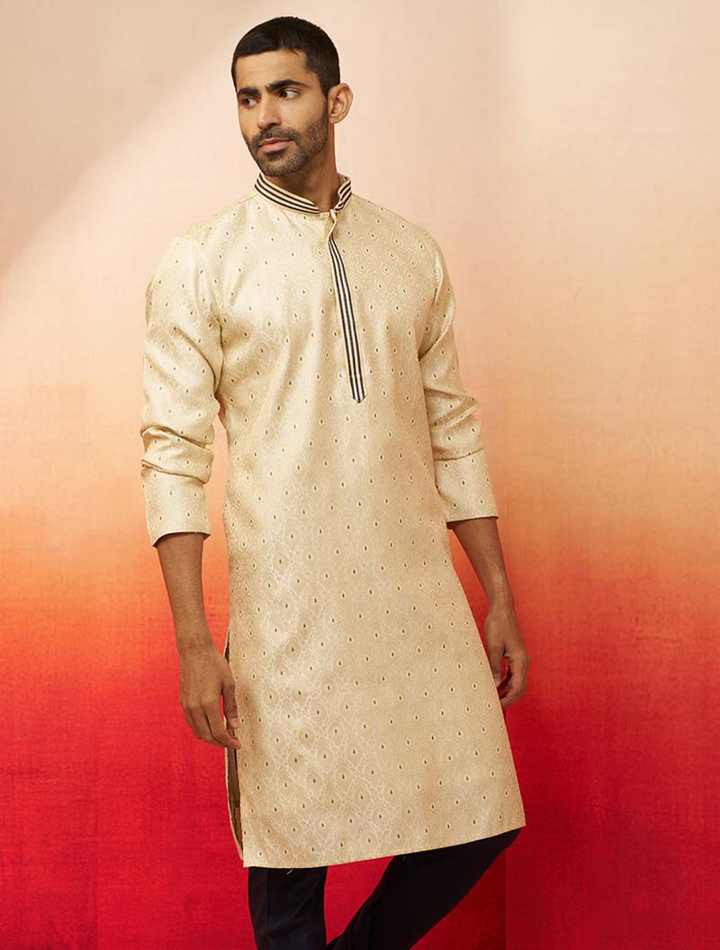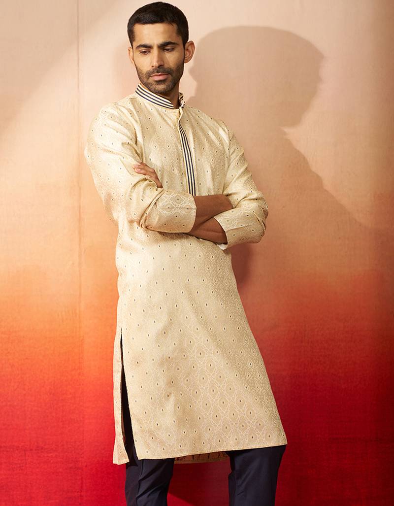 Product Name | Men Cream Royal Blue Silk Jacquard Kurta Premium Zari Embroidered Wedding Wear | |