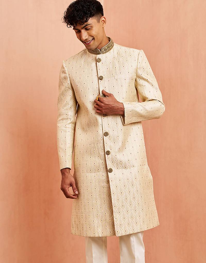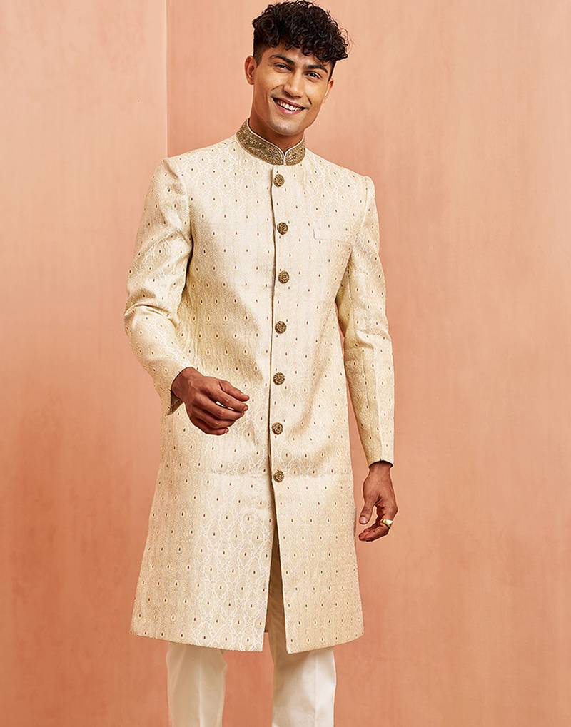 Product Description | Experience Royal Elegance With This Cream Silk Sherwani From Vastramay. Featuring Beautiful Maroon Motif With Intricate Cutdana Work And Sophisticated Mandarin Collar. Crafted From Premium Silk Blend Jacquard Fabric With Luxurious Satin Lining. Perfect For Weddings, Festivals, Diwali, And Traditional Celebrations. The Knee Length Design With Full Sleeves, Embroidered Collar, And Concealed Placket Offers Refined Ethnic Sophistication. |