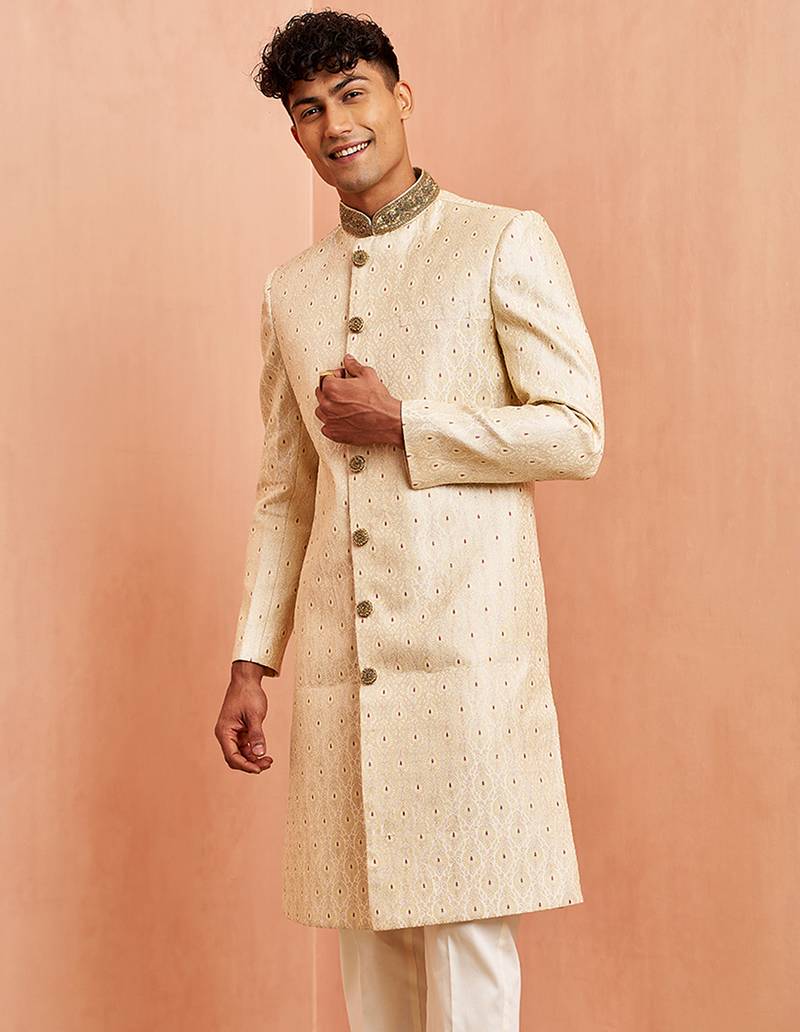 Product Name | Men Cream Silk Sherwani Maroon Motif Mandarin Collar Cutdana Work Wedding | |