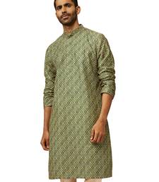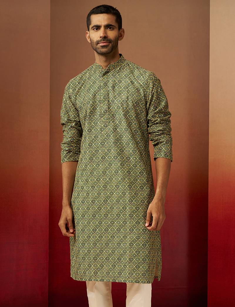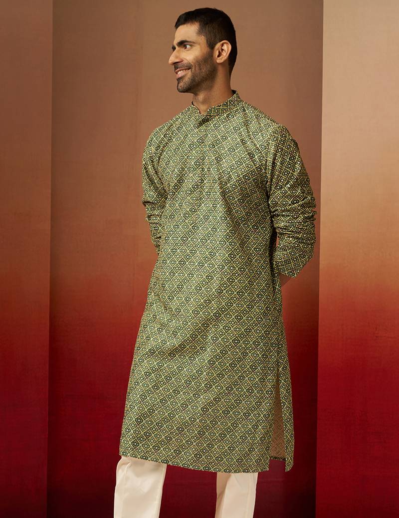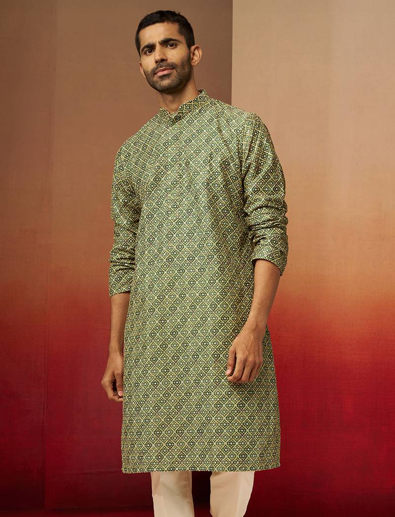 Men green cotton gems work kurta - premium digital floral print festive wear