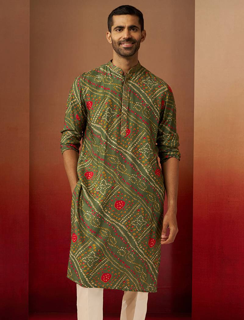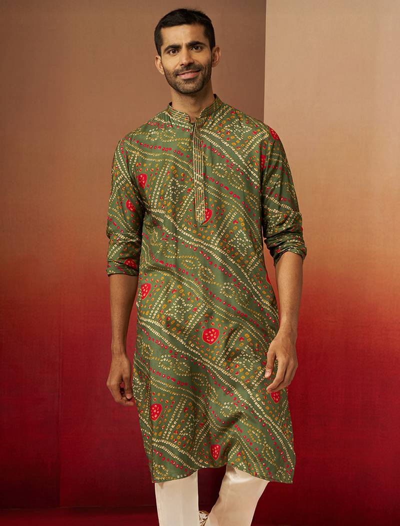 Men green pure muslin bandhani print kurta - traditional digital print festive wear