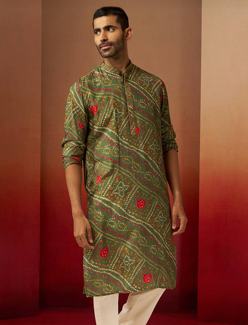 Product Name | Men Green Pure Muslin Bandhani Print Kurta Traditional Digital Print Festive Wear | |