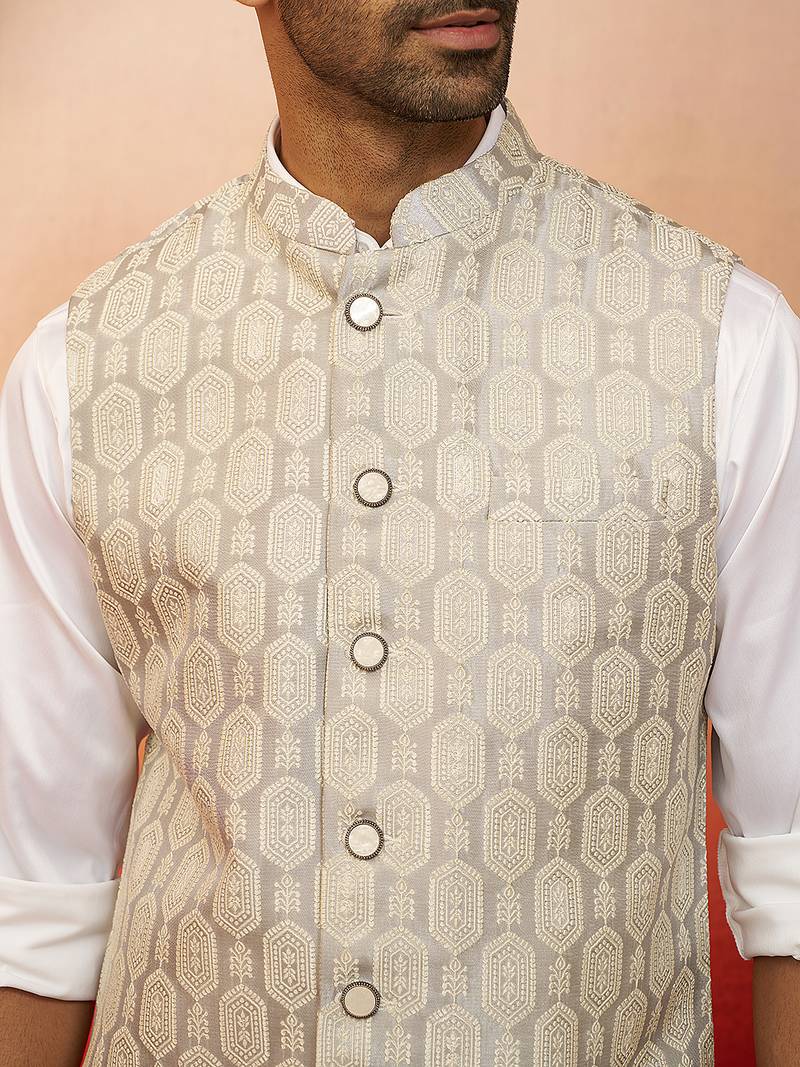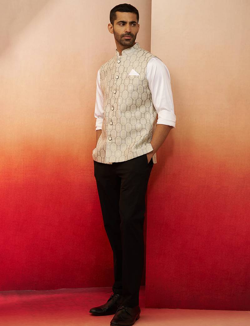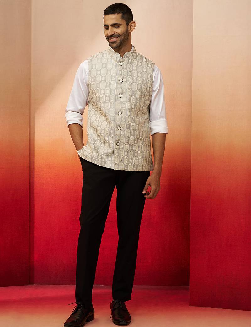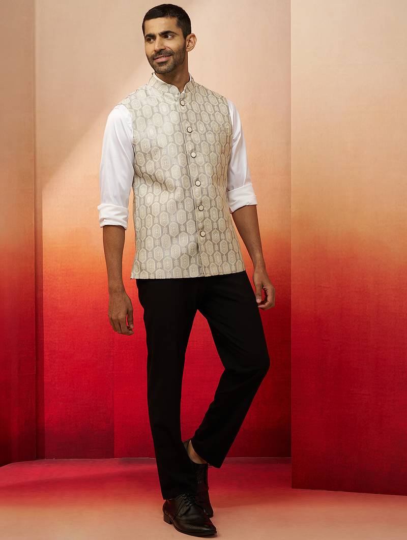 Product Name | Men Cream Silk Nehru Jacket Premium Jacquard Ethnic Contemporary Festive Wear | |