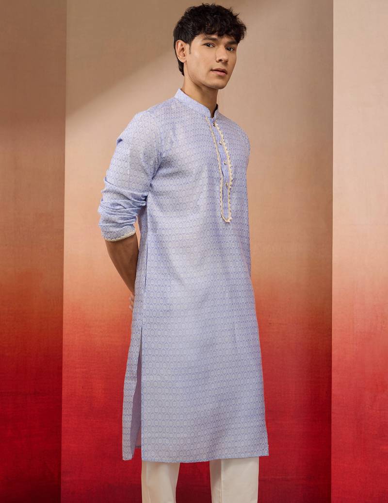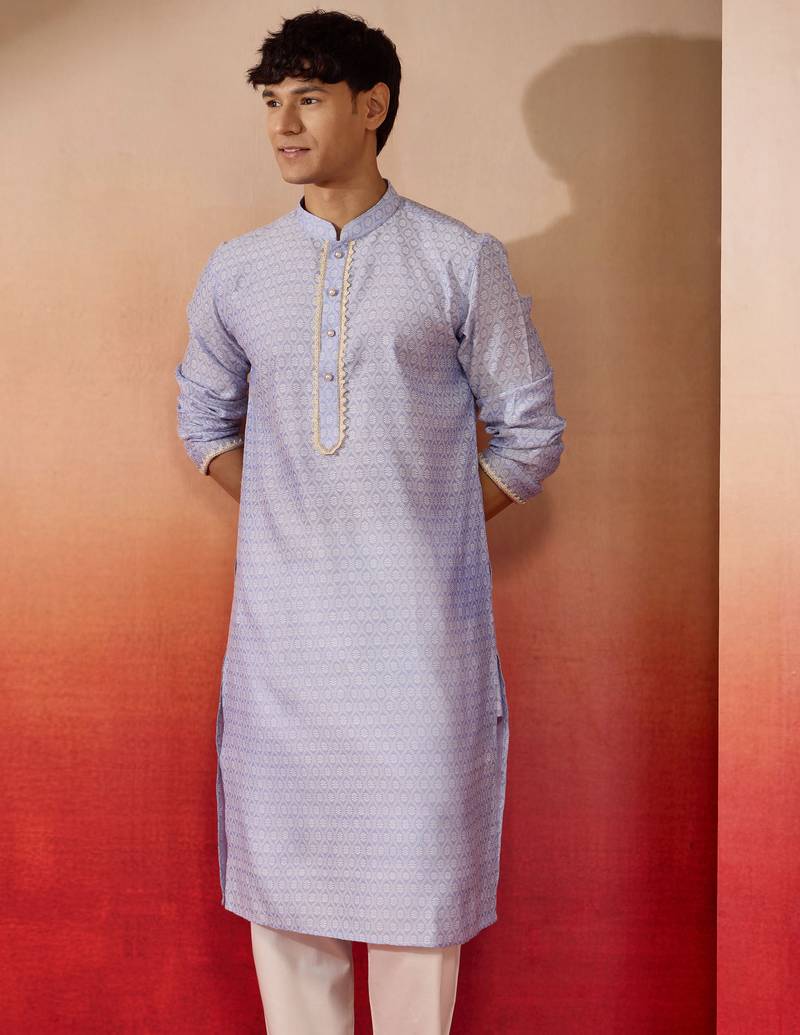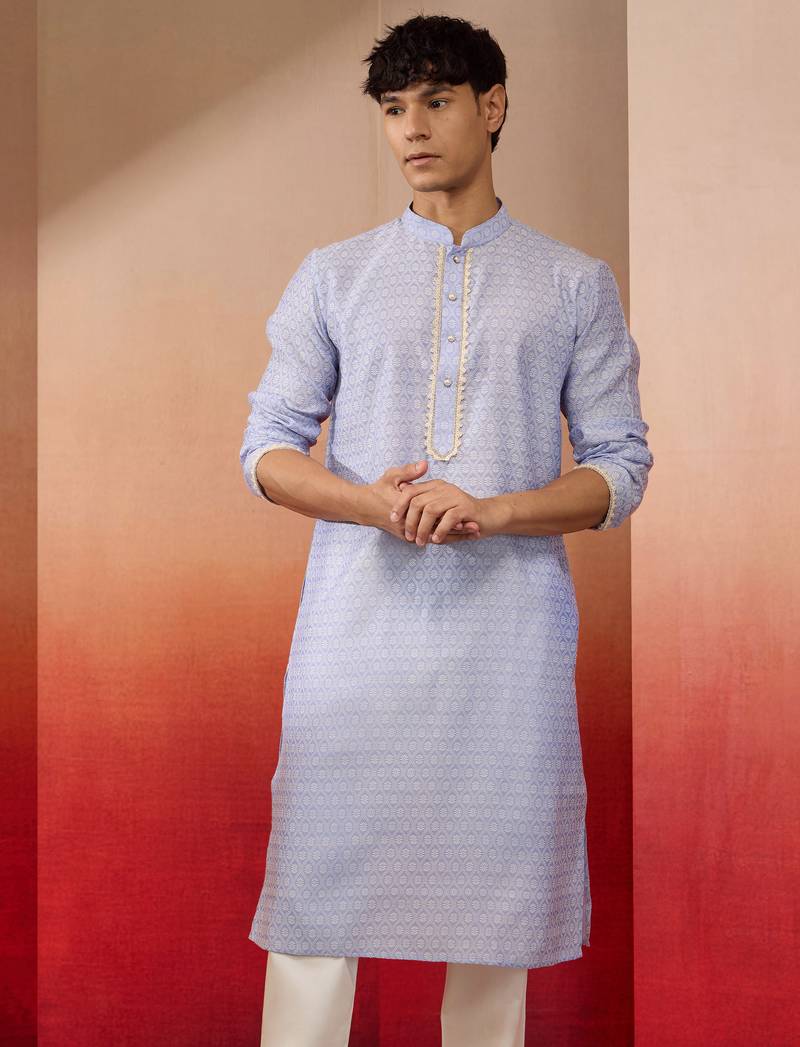 Product Description | Experience Elegance With Vastramay's Hawa Colored Silk Blend Jacquard Kurta Featuring Sophisticated Floral Pattern And Mandarin Collar With Button Closure. Enhanced With Lace Detailing Around Placket, Knee Length With Side Slits And Practical Inseam Pockets. Perfect For Weddings, Navratri, Durga Puja, Diwali, And Refined Festive Celebrations. |