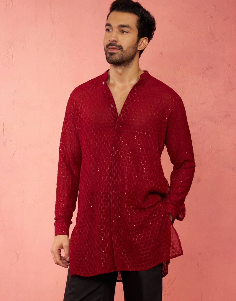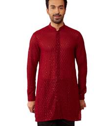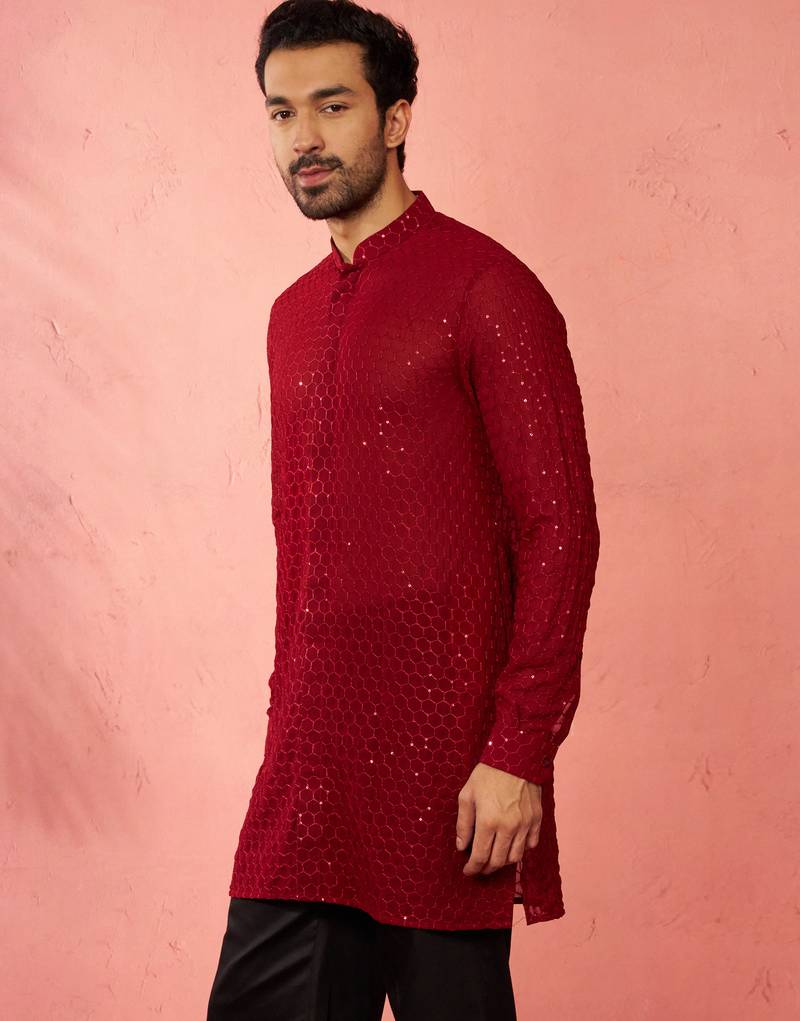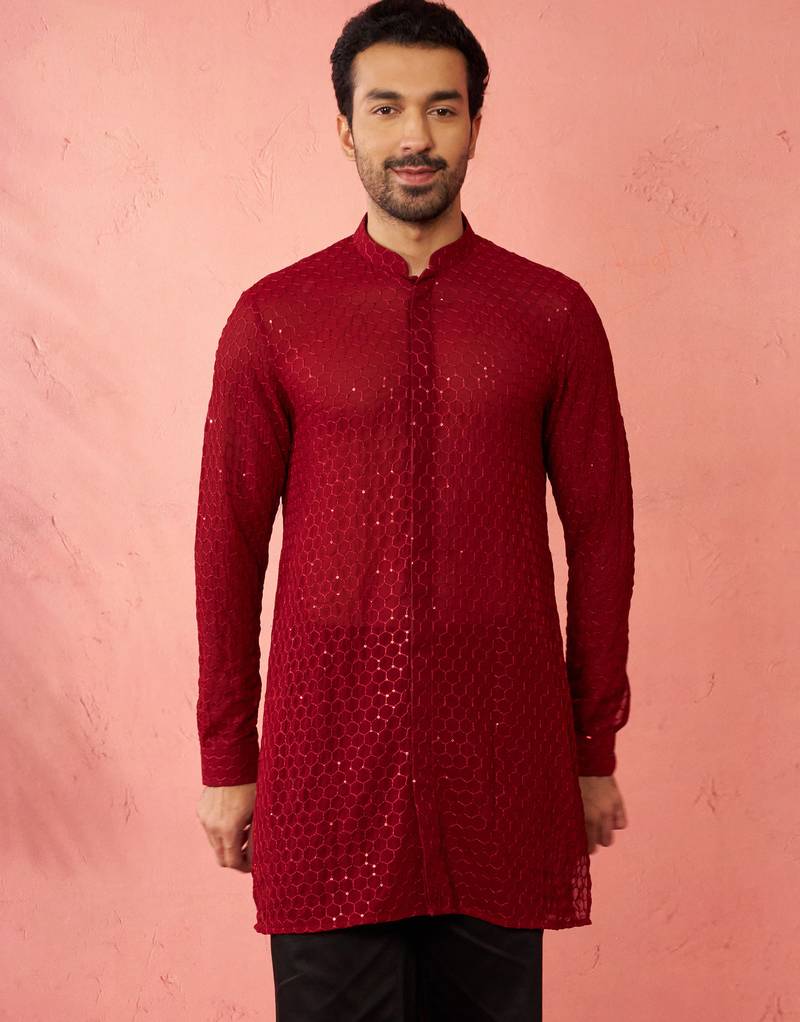 Men maroon georgette mid kurta - premium honey comb embroidery festive party wear