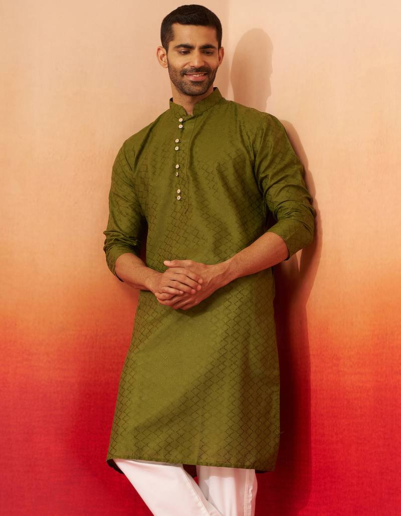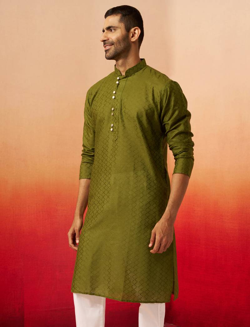 Product Name | Men Mehendi Green Cotton Geometric Jacquard Kurta Premium Barfi Pattern Summer Wear | |