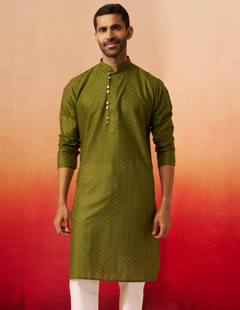 Men mehendi green cotton geometric jacquard kurta - premium barfi pattern summer wear