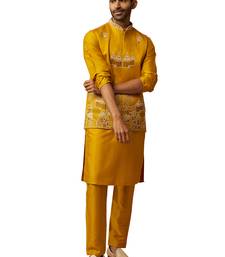 Product Name | Men Mustard Silk 3 Piece Nehru Jacket Set Premium Thread Embroidered Complete Ensemble | |