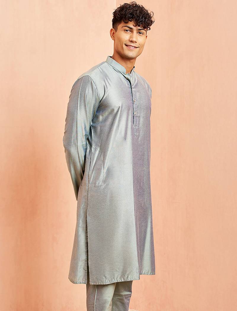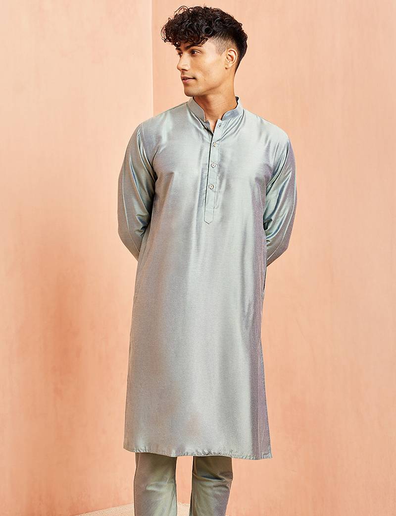 Men silver viscose kurta - long sleeve mandarin collar festive wedding traditional ethnic wear