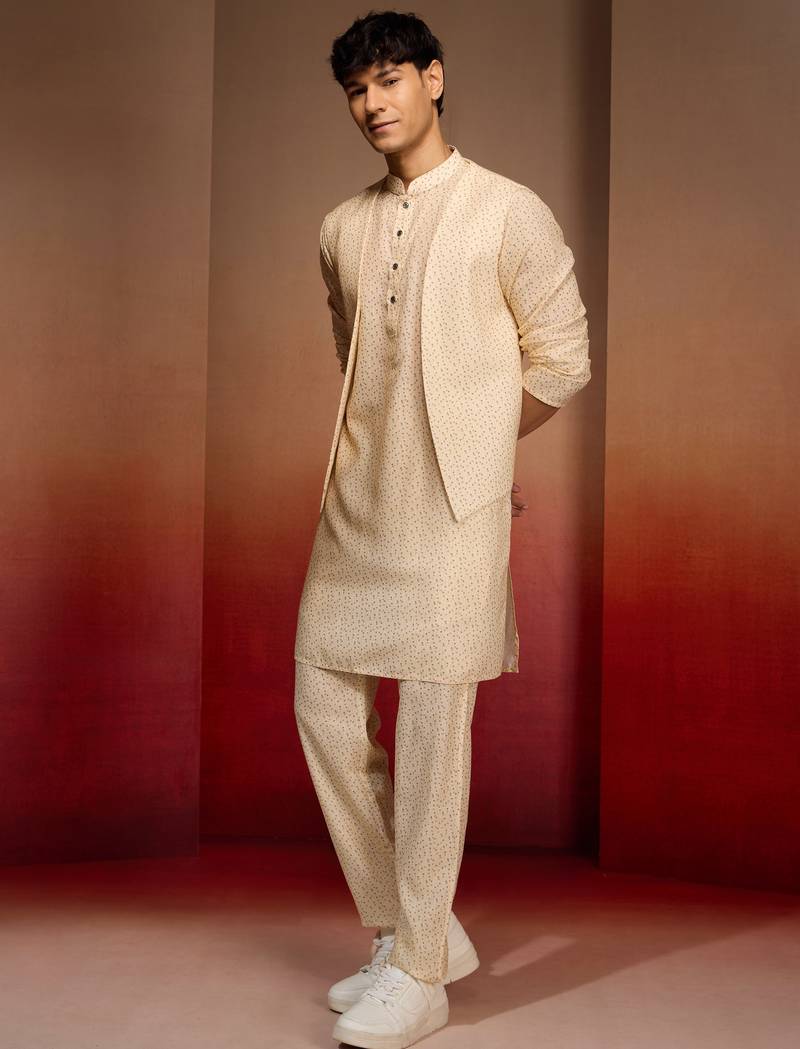Product Description | Make A Stylish Statement With Vastramay's Peach Cotton 3 Piece Nehru Jacket Set Featuring Yellow Contrast With Linen Slub And Digital Geometric Print. Includes Thigh Length Kurta With 2 Inseam Pockets, Front Open Jacket With Curved Hemline, And Comfortable Full Waist Elasticated Yellow Pant With Inseam Pockets. Perfect For Casual Wear, Summer Occasions, Everyday Casuals, And Summer Ease. |