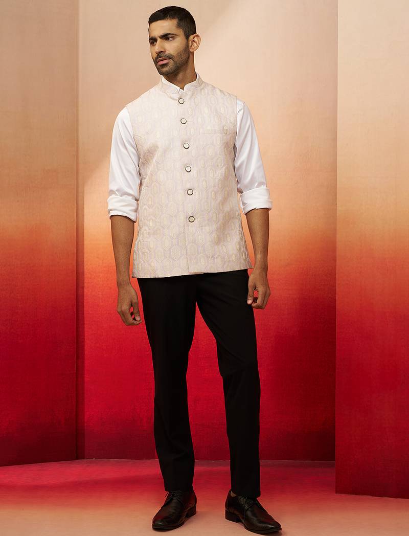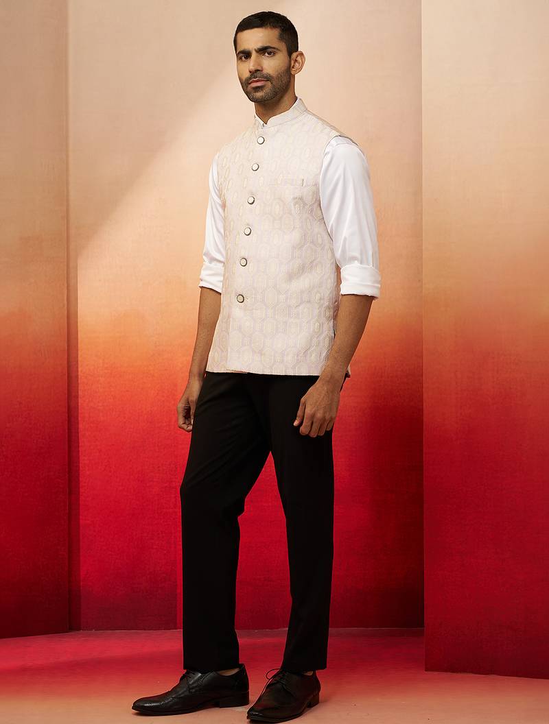 Product Description | Make A Royal Statement With Vastramay's Cream Silk Blend Nehru Jacket Featuring Jacquard Ethnic Motif With Mandarin Collar And Button Closure. Waist Length With Side Slits, Luxurious Satin Lining, And Practical Welt Pocket. Perfect For Festive Occasions, Parties, Weddings, Diwali, And Navratri Celebrations Requiring Sophisticated Ethnic Layering. |