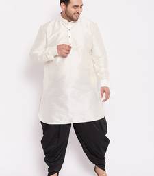 | Product Description | Silk Blend Plus Size Kurta For Men, Has Madarin Collar, Button Closure, Full Sleeves, And Curved Hem. Along With Silk Blend Cowl Pattern Dhoti With Elasticated Waist. |