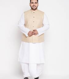 | Product Description | Vastramay Present A Plus Size Solid Kurta Dhoti Set With Jacket. White Solid Straight Knee Length Kurta, Has A Mandarin Collar, Long Sleeves, Straight Hem And Side Slits.White Solid Mid Rise Ready To Wear Dhoti Pant With Pleats, Has A Waistband With Drawstring Closure. Comes With A Maroon Woven Design Matka Silk Nehru Jacket Has A Mandarin Collar, A Full Button Placket, Sleeveless, Three Pockets And Side Slits. |