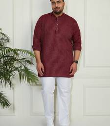 | Product Description | Maroon Woven Stripe Short Kurta, Has A Mandarin Collar, Long Sleeves With Cuffs, Button Placket With Wooden Button, Straight Hem And Side Slits. Comes With Cotton Pant Style Pyjama In White Color, Has Full Length, Elasticated Waist Band And Side Pockets. |