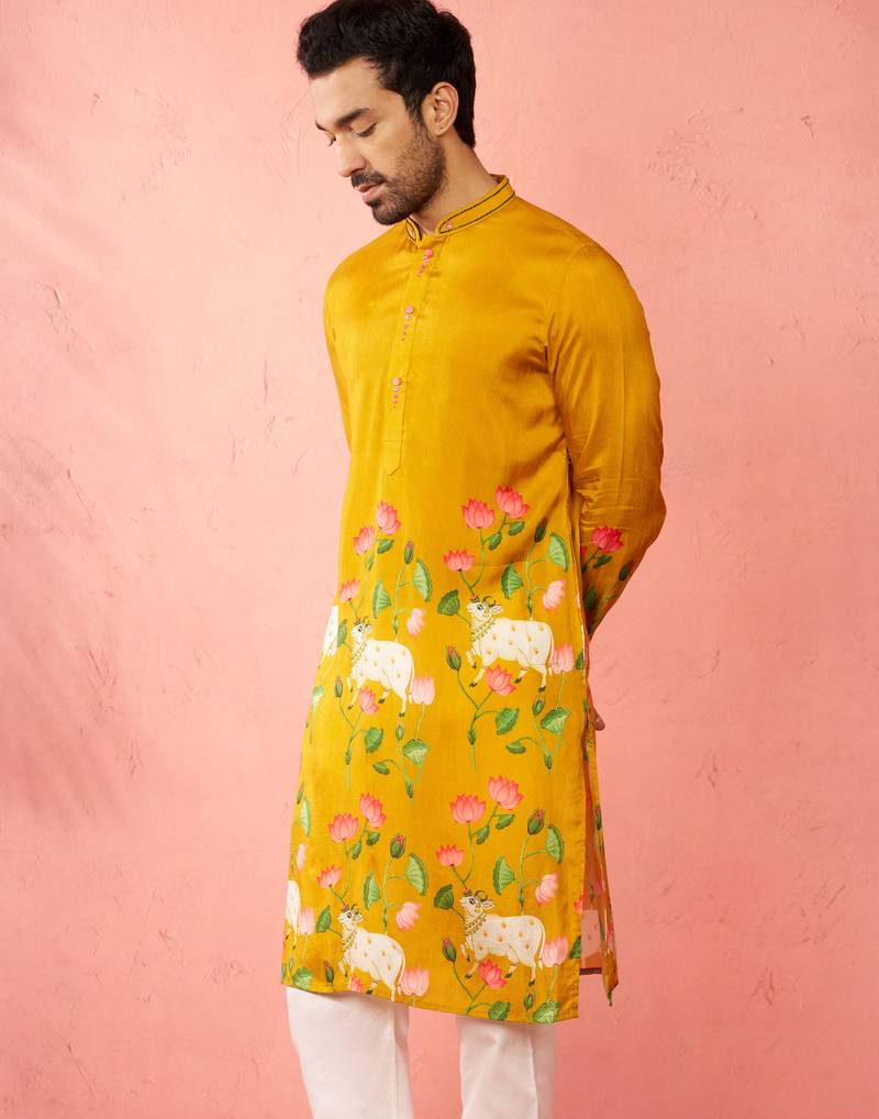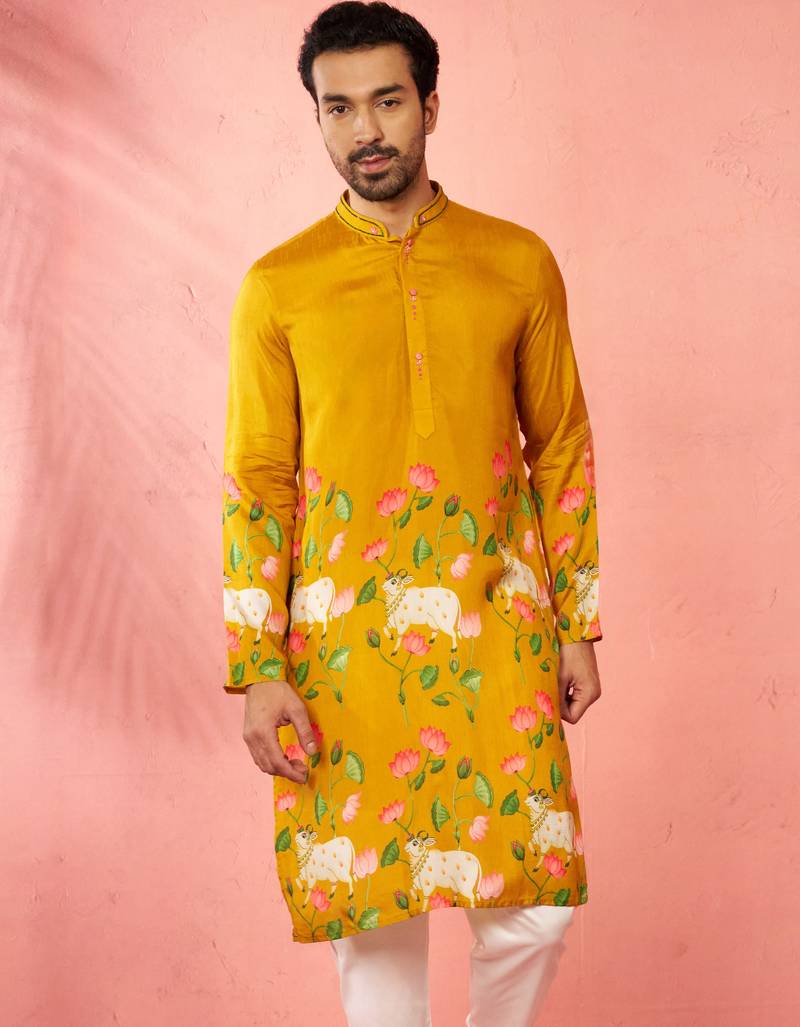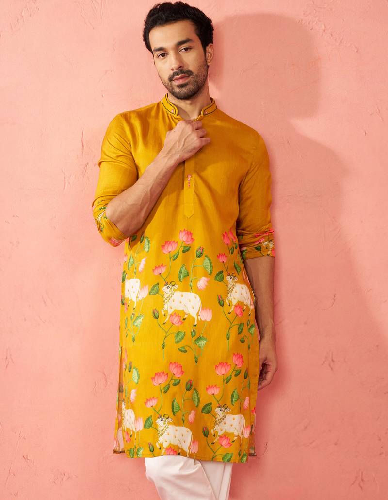 Men's mustard digital print long kurta - rayon cutdana work festive wear