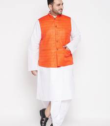 | Product Description | Vastramay Present A Plus Size Solid Kurta Dhoti Set With Jacket. White Solid Straight Knee Length Kurta, Has A Mandarin Collar, Long Sleeves, Straight Hem And Side Slits.White Solid Mid Rise Ready To Wear Dhoti Pant With Pleats, Has A Waistband With Drawstring Closure. Comes With A Orange Woven Design Matka Silk Nehru Jacket Has A Mandarin Collar, A Full Button Placket, Sleeveless, Three Pockets And Side Slits. |