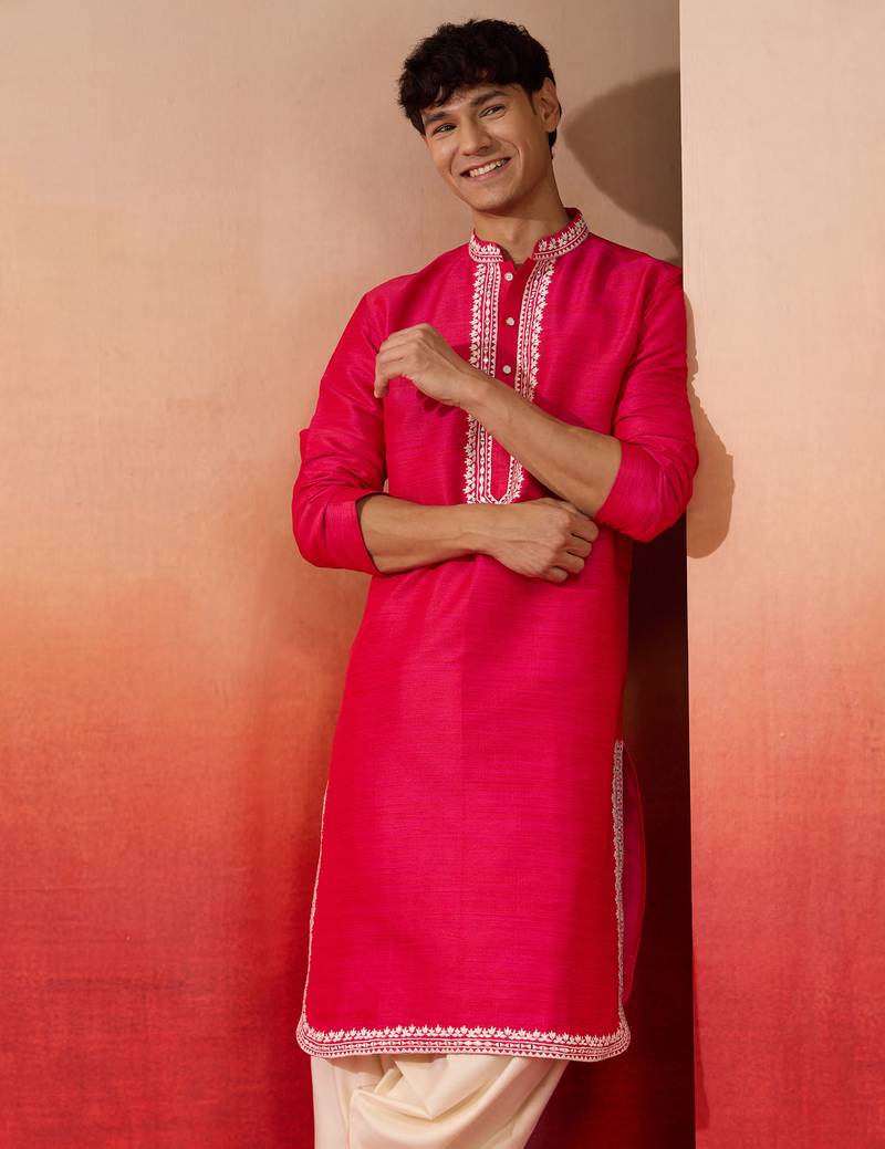 Men's pink hand embroidered silk kurta - premium festive wear