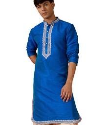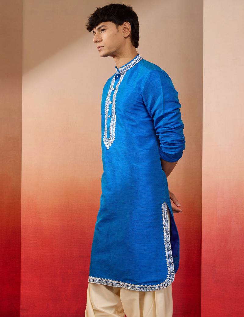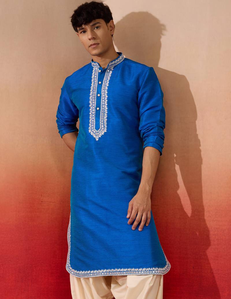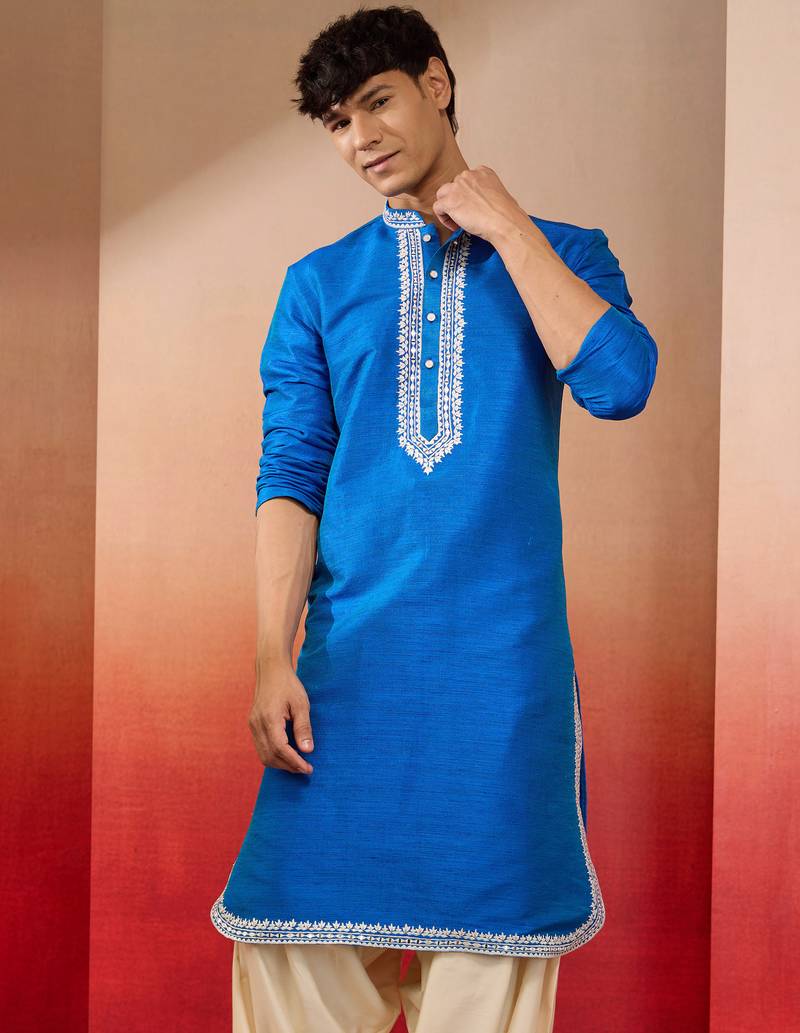Men's royal blue hand embroidered silk kurta - premium festive