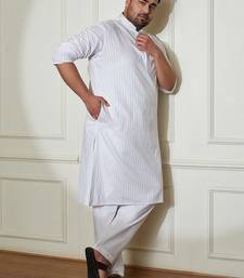 | Product Description | Cotton Kurta For Men With Stripe Design And Embroidered Collar Neck. Has Full Sleeves, Button Closure, Regular Length And Side Slits. Comes With Cotton Pant Style Pyjama In White Color, Has Full Length, Elasticated Waist Band And Side Pockets. |