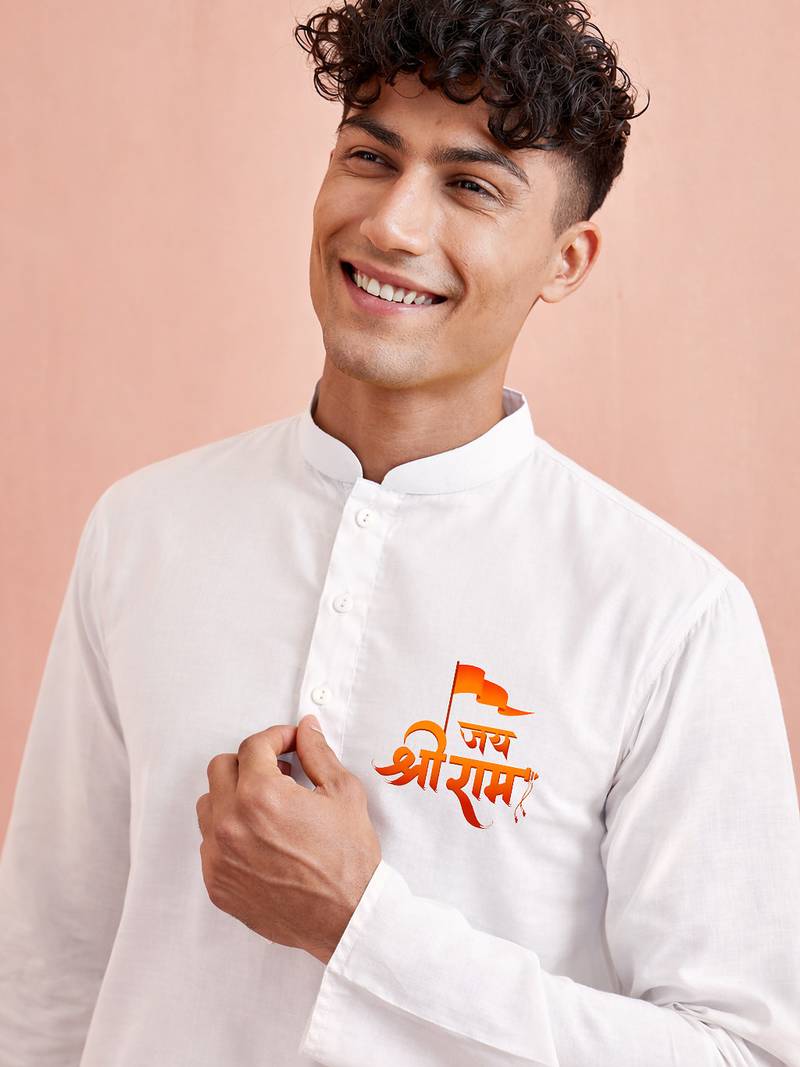 | Product Description | White Pure Cotton Men's Kurta Features Ram Chest Print Placement For Hanuman Jayanti, Full Sleeves, Chinese Collar Kameez, Button Front, Knee Length, Side Slits, Matching Cotton Pyjama. Plain Work, Traditional Style, White Fabric. Stitched Construction. Suitable For Festive Rituals, Temple Outings, Casual Summer Events Across India. Top In White Cotton |