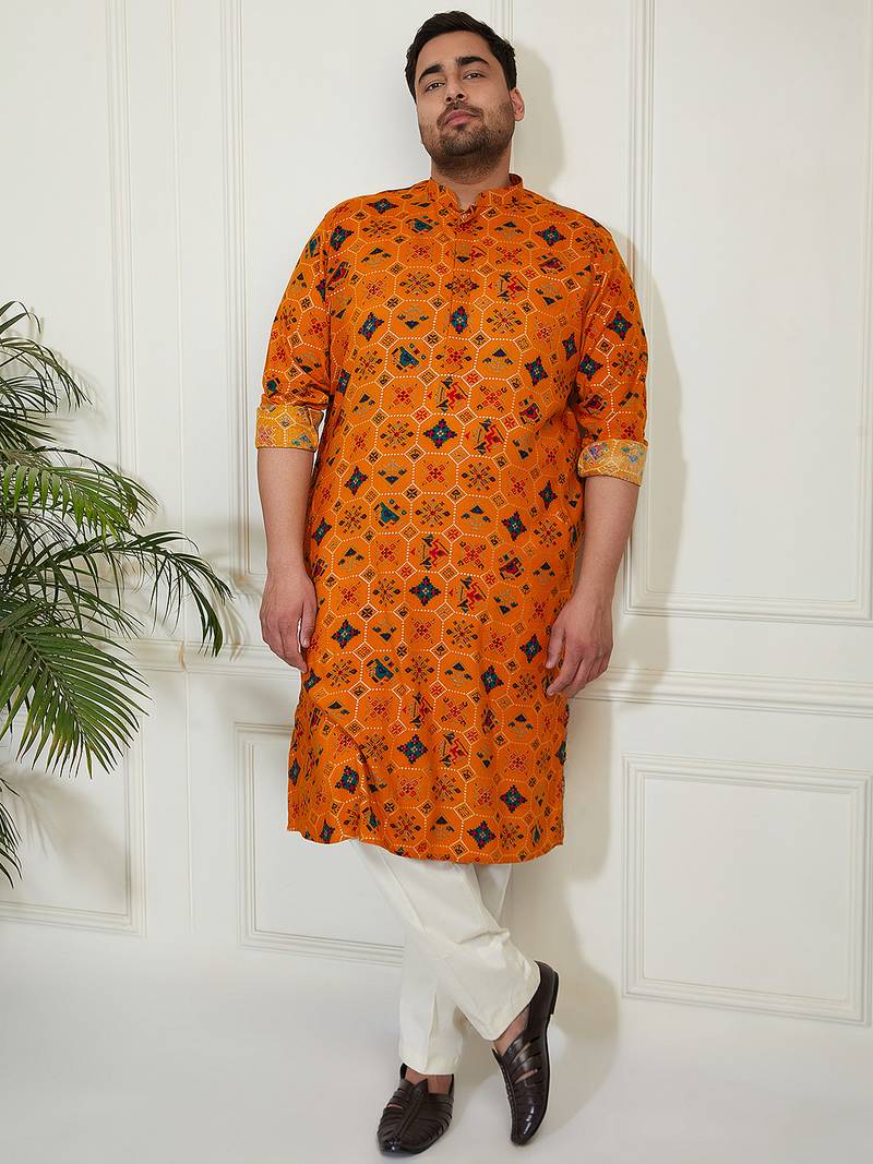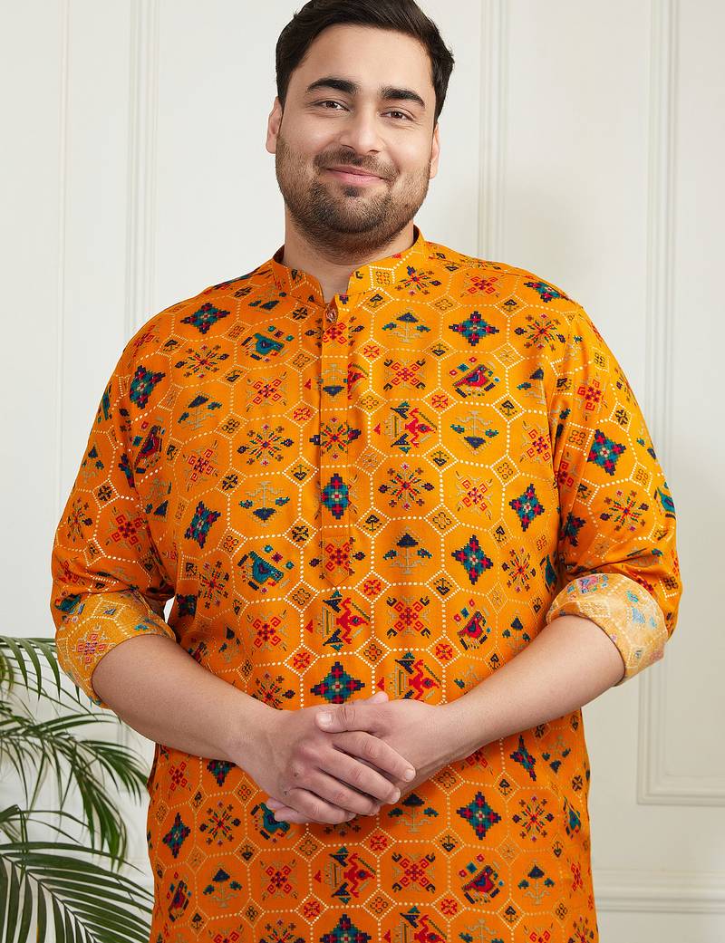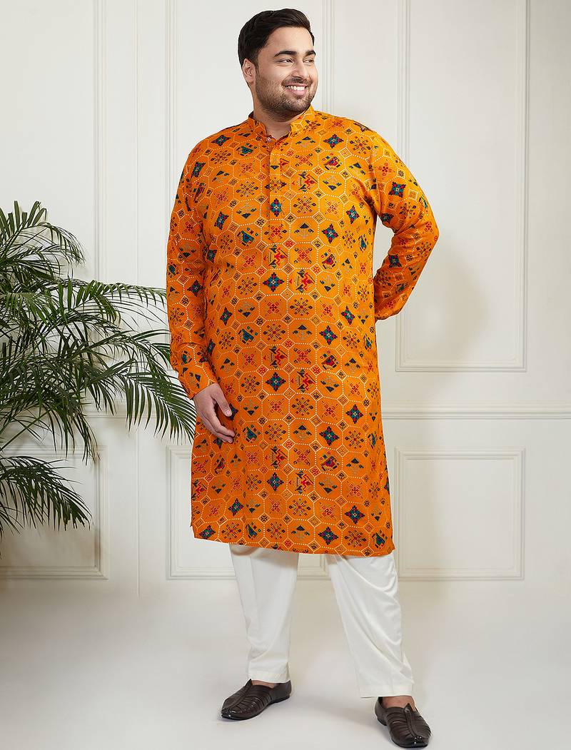 | Product Description | Gold Foil Printed Patola Design Kurta, Has Mandarin Neckline, Full Sleeves, And Knee Length With Relaxed Fit. Comes With Viscose Pant Style Pyjama |
