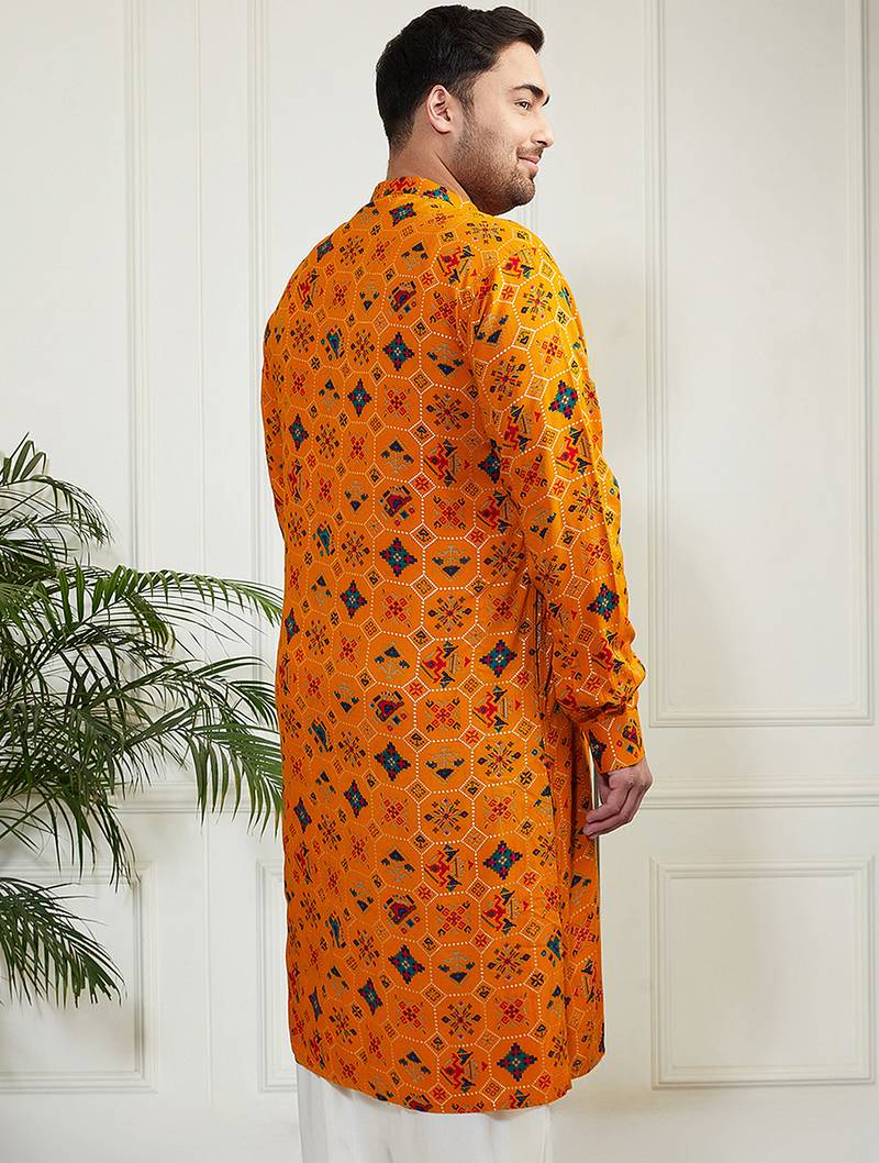 | Product Description | Gold Foil Printed Patola Design Kurta, Has Mandarin Neckline, Full Sleeves, And Knee Length With Relaxed Fit |
