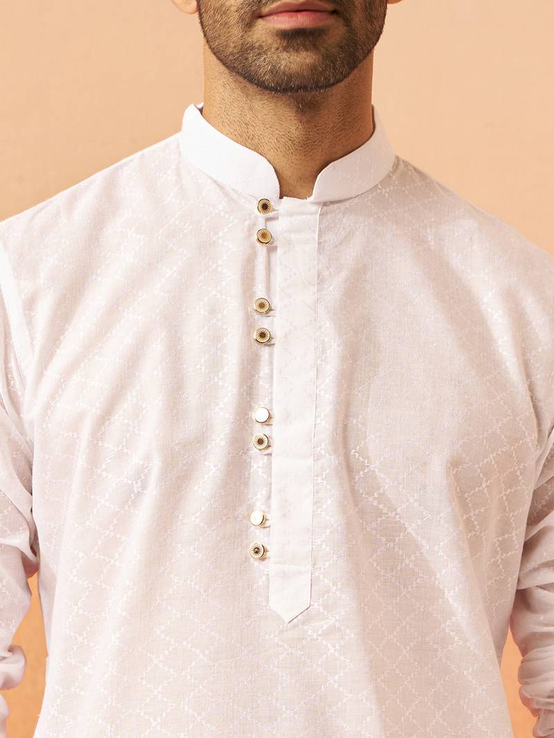 Men white cotton geometric jacquard kurta - premium barfi pattern versatile wear