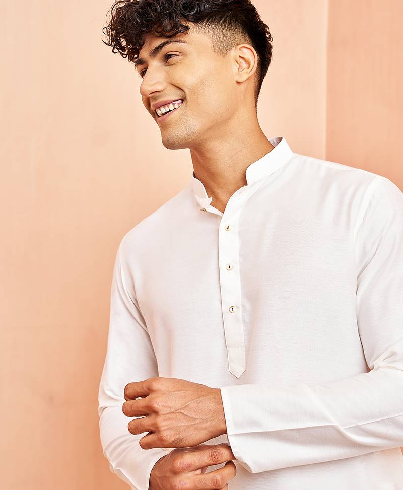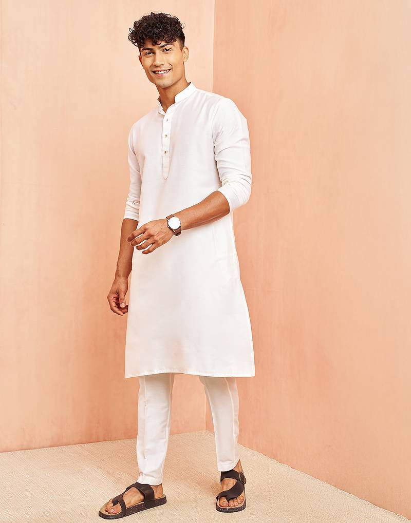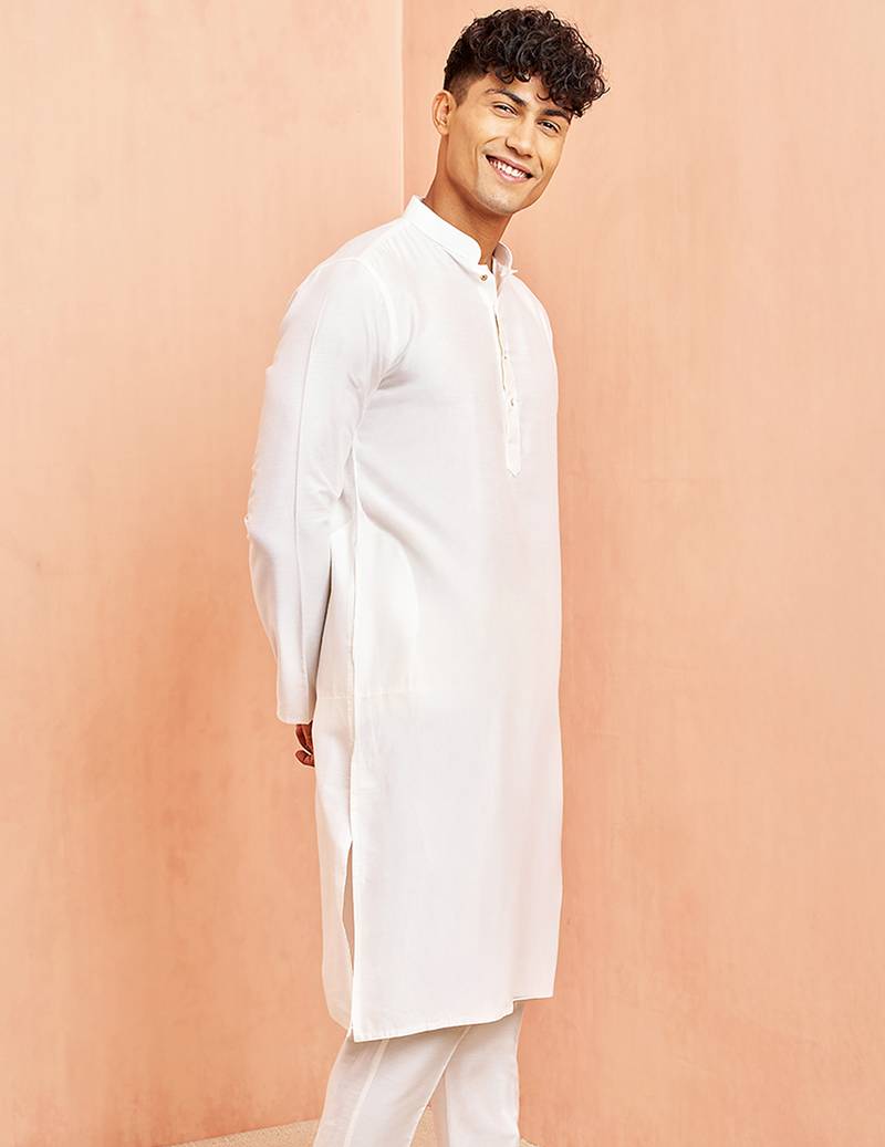 Men white viscose kurta - long sleeve mandarin collar festive wedding traditional ethnic wear